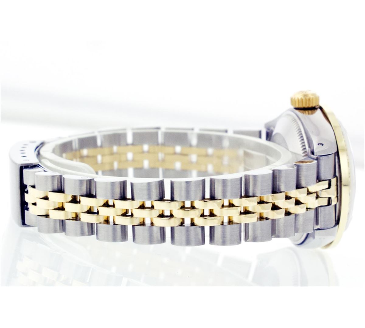 One Ladies Two Tone Rolex Datejust Polished, Serviced & Electronically Tested, 14K Yellow Gold & Stainless Steel Case: 26mm, 14K Yellow Gold Crown, Custom Bezel: 18K Yellow Gold Beadset Diamond Bezel, Diamond Count: 32 Diamonds Total Weight .70 Carat, Clarity: Si-VS, Color: G to H. Custom Crystal: Synthetic Sapphire Cyclops Lens. Movement: Automatic Winding Movement Caliber 2030. Custom Dial: Silver Dial Set With Diamond Hour Markers, 10 Diamond in Dial G To H In Color, Si-VS Clarity. Date Window: 3 O'Clock Position Date Display, Non Quickset, Model: 6917 Condition: G-6 Extra Fine. Bracelet: Two Tone 14K Yellow Gold & Stainless Steel Jubilee. Bright Polish. 5.5 Inch Length, Adjustable. Standard Clasp, With Rolex Logo.