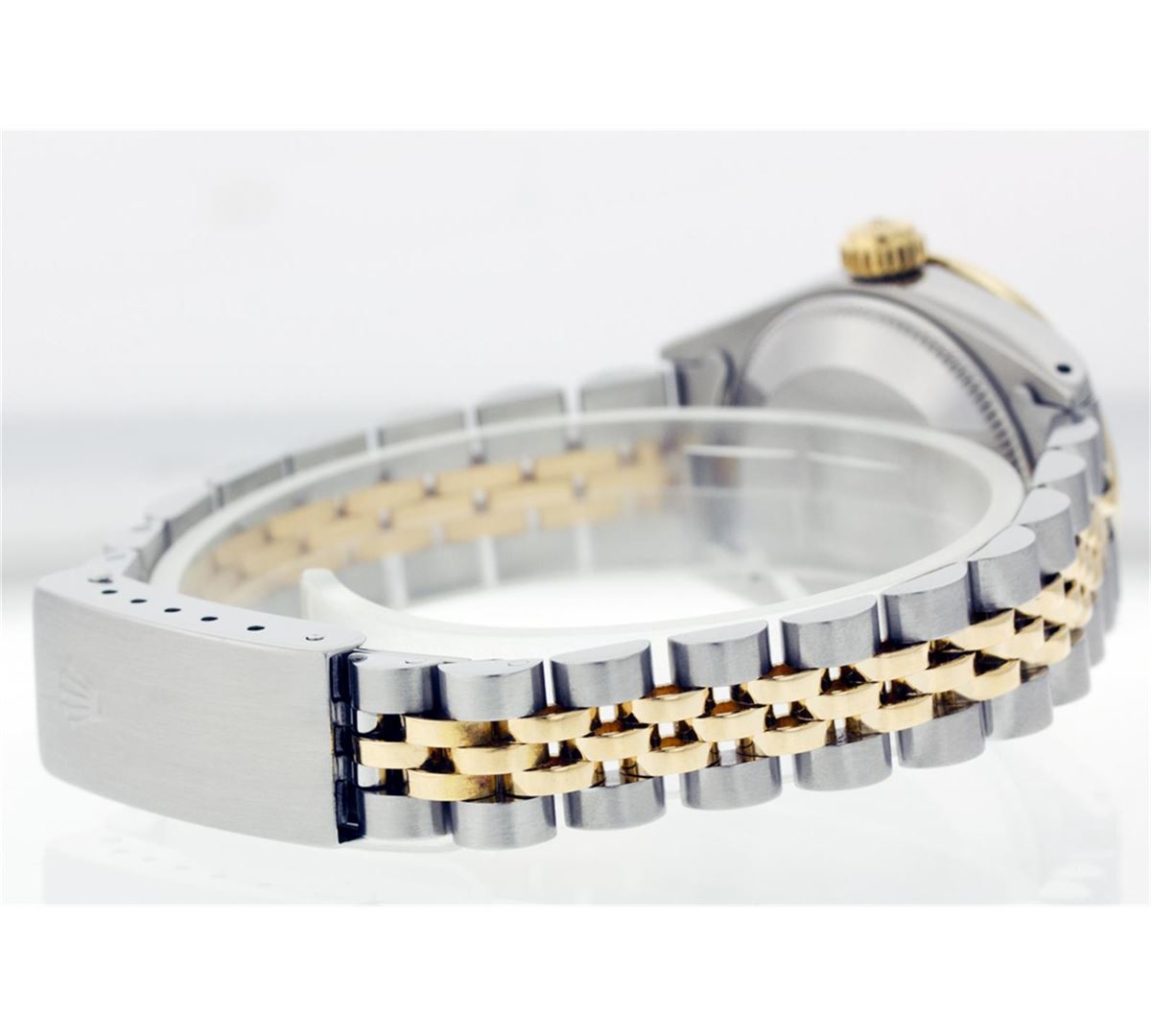 One Ladies Two Tone Rolex Datejust Polished, Serviced & Electronically Tested, 14K Yellow Gold & Stainless Steel Case:26mm, 14K Yellow Gold Crown, Custom Bezel: 18K Yellow Gold Beadset Diamond Bezel, Diamond Count: 32 Diamonds Total Weight .70 Carat, Clarity: Si-VS, Color: G to H. Custom Crystal: Synthetic Sapphire Cyclops Lens. Movement: Automatic Winding Movement Caliber 2030. Custom Dial: Mother Of Pearl Roman Dial. Date Window: 3 O'Clock Position Date Display, Non Quickset, Model: 6917 Condition: G-6 Extra Fine. Bracelet: Two Tone 14K Yellow Gold & Stainless Steel Jubilee. Bright Polish. 5.5 Inch Length, Adjustable. Standard Clasp, With Rolex Logo.