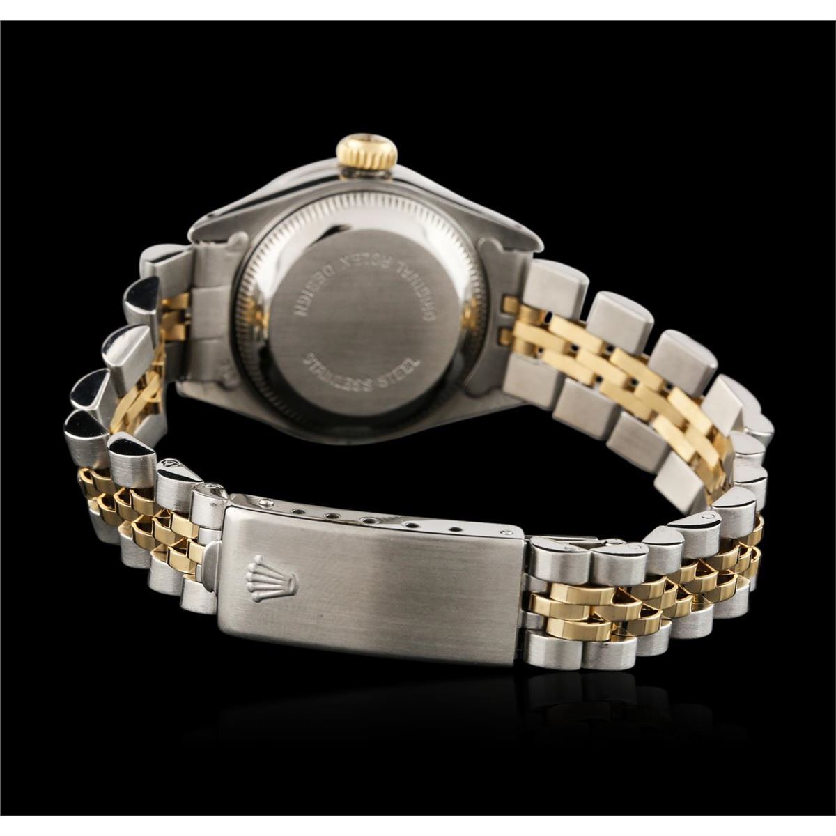 One ladies, hand crafted & machine milled Rolex DateJust Model wristwatch electronically tested, Stainless Steel Case: 26mm oyster, Crown: 14KT yellow gold twinlock with logo, Custom Bezel: diamond set, Custom Crystal: synthetic sapphire cyclops lens. Movement: superlative chronometer. Custom Dial: light mother of pearl, with baton hands, and diamond markers, Date Window: 3 o'clock position date display, quick set, Circa: 1983, Condition: G-4 Average. Bracelet: stainless steel and 14KT yellow gold jubilee. Bright polish & brushed finish. Six and three quarter inch length, adjustable. Standard clasp, with logo. Containing: Forty round brilliant cut diamonds, 1.50mm in diameter average, approximate. Total Weight of 40 stones = 0.50ct. Set and graded in the bezel. Clarity: SI-1 to I-1. Color: F - H. Total Weight of Diamonds 0.50ct. Total Weight of Watch 54.73 grams. AIG Appraised at $8,050.00.
