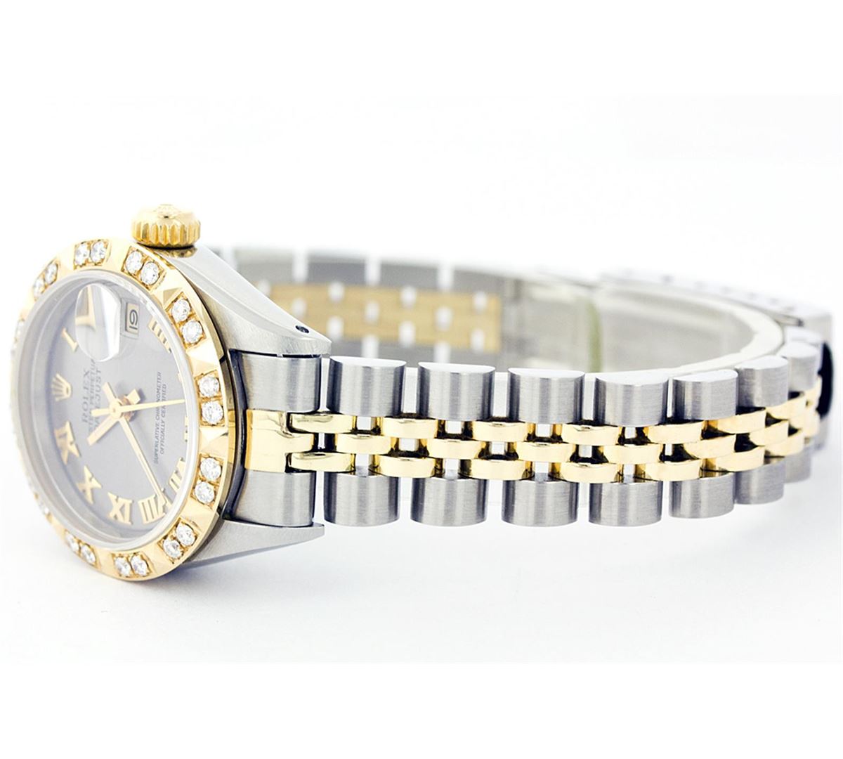 One Ladies Two Tone Rolex Datejust Polished, Serviced & Electronically Tested, 14K Yellow Gold & Stainless Steel Case:26mm, 14K Yellow Gold Crown, Custom Bezel: 18K Yellow Gold Pyramid Diamond Bezel, Diamond Count: 24 Diamonds Total Weight .50 Carat, Clarity: Si-VS, Color: G to H. Custom Crystal: Synthetic Sapphire Cyclops Lens. Movement: Automatic Winding Movement Caliber 2030. Custom Dial: Slate Grey With Roman Hour Markers. Date Window: 3 O'Clock Position Date Display, Non Quickset, Model: 6917 Condition: G-6 Extra Fine. Bracelet: Two Tone 14K Yellow Gold & Stainless Steel Jubilee. Bright Polish. 5.5 Inch Length, Adjustable. Standard Clasp, With Rolex Logo.
