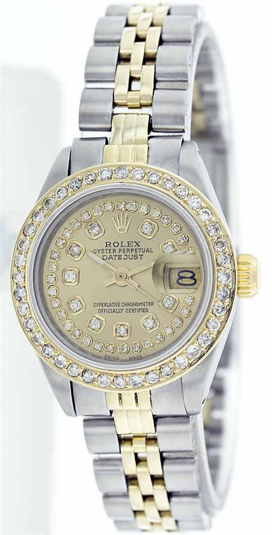 One Ladies Two Tone Rolex Datejust Polished, Serviced & Electronically Tested, 14K Yellow Gold & Stainless Steel Case:26mm, 14K Yellow Gold Crown, Custom Bezel: 18K Yellow Gold Beadset Diamond Bezel, Diamond Count: 32 Diamonds Total Weight .70 Carat, Clarity: Si-VS, Color: G to H. Custom Crystal: Synthetic Sapphire Cyclops Lens. Movement: Automatic Winding Movement Caliber 2030. Custom Dial: Champagne String Diamond Dial, Diamond Count: 43 Diamonds, Clarity: SI-VS, Color: G to H. Date Window: 3 O'Clock Position Date Display, Non Quickset, Model: 6917 Condition: G-6 Extra Fine. Bracelet: Two Tone 14K Yellow Gold & Stainless Steel Jubilee. Bright Polish. 5.5 Inch Length, Adjustable. Standard Clasp, With Rolex Logo.