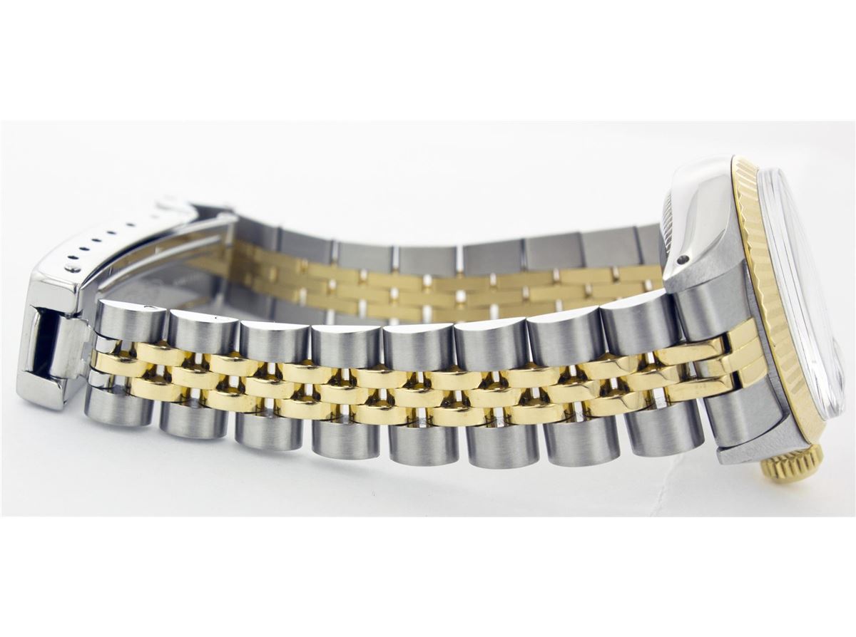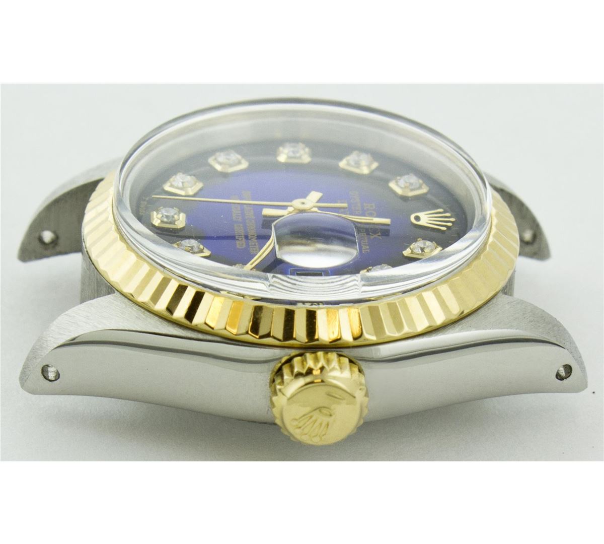 One Ladies Two Tone Rolex Datejust Polished, Serviced & Electronically Tested, 14K Yellow Gold & Stainless Steel Case:26mm, 14K Yellow Gold Crown, Bezel: 14K Yellow Gold Fluted Bezel. Custom Crystal: Acrylic Cyclops Lens. Movement: Automatic Winding Movement Caliber 2030. Custom Dial: Blue Vignette With Diamond Dial, Diamond Count: 10 Diamonds, Clarity: SI-VS, Color: G To H. Date Window: 3 O'Clock Position Date Display, Non Quickset, Model: 6917 Condition: G-6 Extra Fine. Bracelet: Two Tone 14K Yellow Gold & Stainless Steel Jubilee. Bright Polish. 5.5 Inch Length, Adjustable. Standard Clasp, With Rolex Logo.