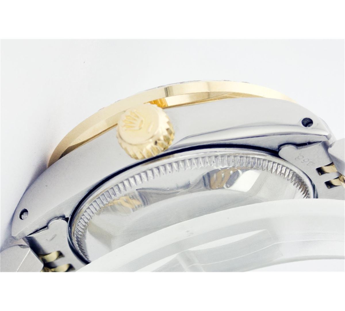 One Ladies Two Tone Rolex Datejust Polished, Serviced & Electronically Tested, 14K Yellow Gold & Stainless Steel Case:26mm, 14K Yellow Gold Crown, Custom Bezel: 18K Yellow Gold Pyramid Diamond Bezel, Diamond Count: 24 Diamonds Total Weight .50 Carat, Clarity: Si-VS, Color: G to H. Custom Crystal: Synthetic Sapphire Cyclops Lens. Movement: Automatic Winding Movement Caliber 2030. Custom Dial: Slate Grey With Roman Hour Markers. Date Window: 3 O'Clock Position Date Display, Non Quickset, Model: 6917 Condition: G-6 Extra Fine. Bracelet: Two Tone 14K Yellow Gold & Stainless Steel Jubilee. Bright Polish. 5.5 Inch Length, Adjustable. Standard Clasp, With Rolex Logo.