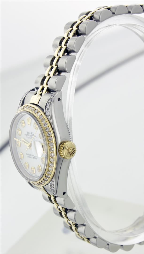 One Ladies Two Tone Rolex Datejust Polished, Serviced & Electronically Tested, 14K Yellow Gold & Stainless Steel Case:26mm, 14K Yellow Gold Crown, Diamond Lugs: Color: G to H, Clarity: SI-VS. Custom Bezel: 18K Yellow Gold Beadset Diamond Bezel, Diamond Count: 32 Diamonds Total Weight .70 Carat, Clarity: Si-VS, Color: G to H. Custom Crystal: Synthetic Sapphire Cyclops Lens. Movement: Automatic Winding Movement Caliber 2030. Custom Dial: Mother Of Pearl With Diamond Hour Markers, Stone Count: 10 Diamonds. Date Window: 3 O'Clock Position Date Display, Non Quickset, Model: 6917 Condition: G-6 Extra Fine. Bracelet: Two Tone 14K Yellow Gold & Stainless Steel Jubilee. Bright Polish. 5.5 Inch Length, Adjustable. Standard Clasp, With Rolex Logo.