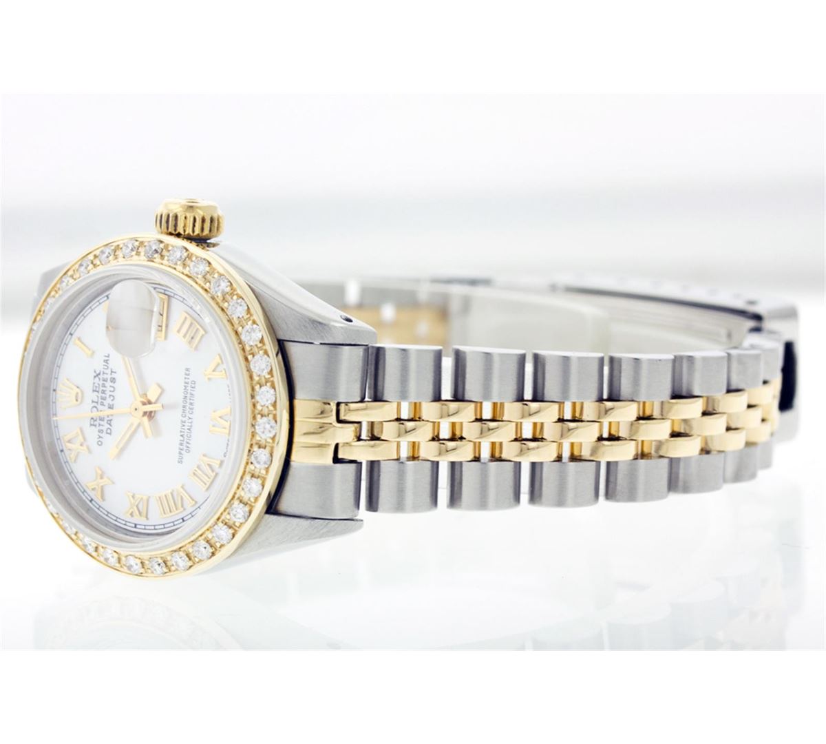 One Ladies Two Tone Rolex Datejust Polished, Serviced & Electronically Tested, 14K Yellow Gold & Stainless Steel Case:26mm, 14K Yellow Gold Crown, Custom Bezel: 18K Yellow Gold Beadset Diamond Bezel, Diamond Count: 32 Diamonds Total Weight .70 Carat, Clarity: Si-VS, Color: G to H. Custom Crystal: Synthetic Sapphire Cyclops Lens. Movement: Automatic Winding Movement Caliber 2030. Custom Dial: Mother Of Pearl Roman Dial. Date Window: 3 O'Clock Position Date Display, Non Quickset, Model: 6917 Condition: G-6 Extra Fine. Bracelet: Two Tone 14K Yellow Gold & Stainless Steel Jubilee. Bright Polish. 5.5 Inch Length, Adjustable. Standard Clasp, With Rolex Logo.