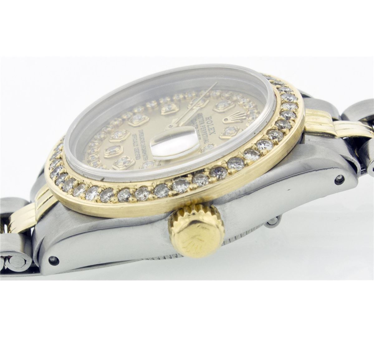 One Ladies Two Tone Rolex Datejust Polished, Serviced & Electronically Tested, 14K Yellow Gold & Stainless Steel Case:26mm, 14K Yellow Gold Crown, Custom Bezel: 18K Yellow Gold Beadset Diamond Bezel, Diamond Count: 32 Diamonds Total Weight .70 Carat, Clarity: Si-VS, Color: G to H. Custom Crystal: Synthetic Sapphire Cyclops Lens. Movement: Automatic Winding Movement Caliber 2030. Custom Dial: Champagne String Diamond Dial, Diamond Count: 43 Diamonds, Clarity: SI-VS, Color: G to H. Date Window: 3 O'Clock Position Date Display, Non Quickset, Model: 6917 Condition: G-6 Extra Fine. Bracelet: Two Tone 14K Yellow Gold & Stainless Steel Jubilee. Bright Polish. 5.5 Inch Length, Adjustable. Standard Clasp, With Rolex Logo.