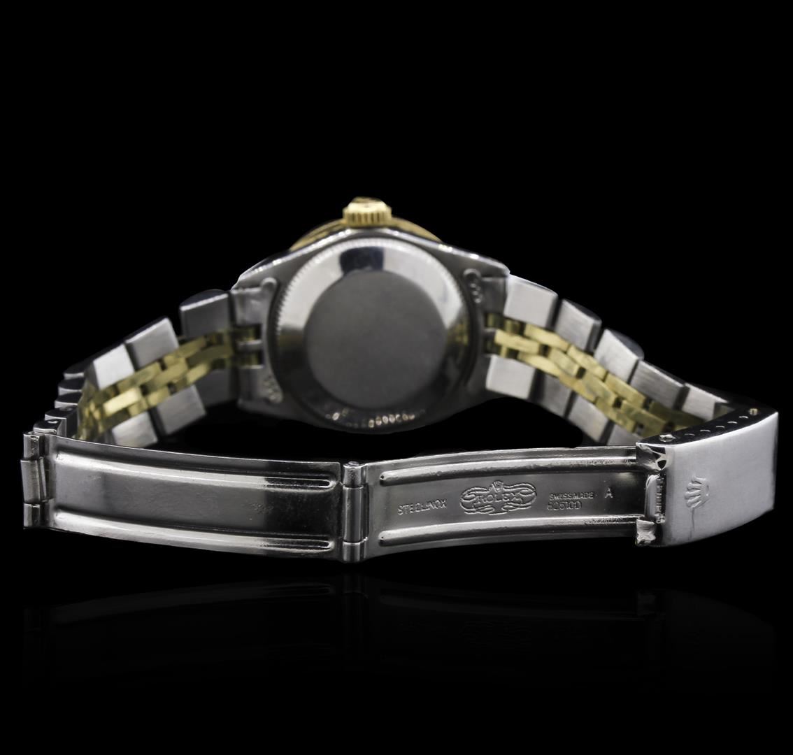 One ladies, hand crafted & machine milled Rolex DateJust Model wristwatch electronically tested, Stainless Steel Case: 25mm oyster, Crown: 14KT yellow gold, twinlock with logo, Custom Bezel: diamond set, Custom Crystal: acrylic cyclops lens. Movement: superlative chronometer. Custom Dial: mother of pearl, with luminous hands, and diamond markers, Date Window: 3 o'clock position date display, non-quick set. Circa: 1966, Condition: G-4 Average. Bracelet: stainless steel and 14KT yellow gold jubilee links. Bright polish & brushed finish. Five and three quarter inch length, adjustable. Standard clasp, with logo. Diamond Info: Total of fifty round brilliant cut diamonds, 1.45mm in diameter, approximate total weight of 50 stones = 0.56ct. Set and graded in the bezel and the dial. Clarity: SI-2 to I-1. Color: H-J. Total Weight of Diamonds: 0.56ct. Total Weight of Watch: 43.03 grams. AIG Appraised at $5,330.00.