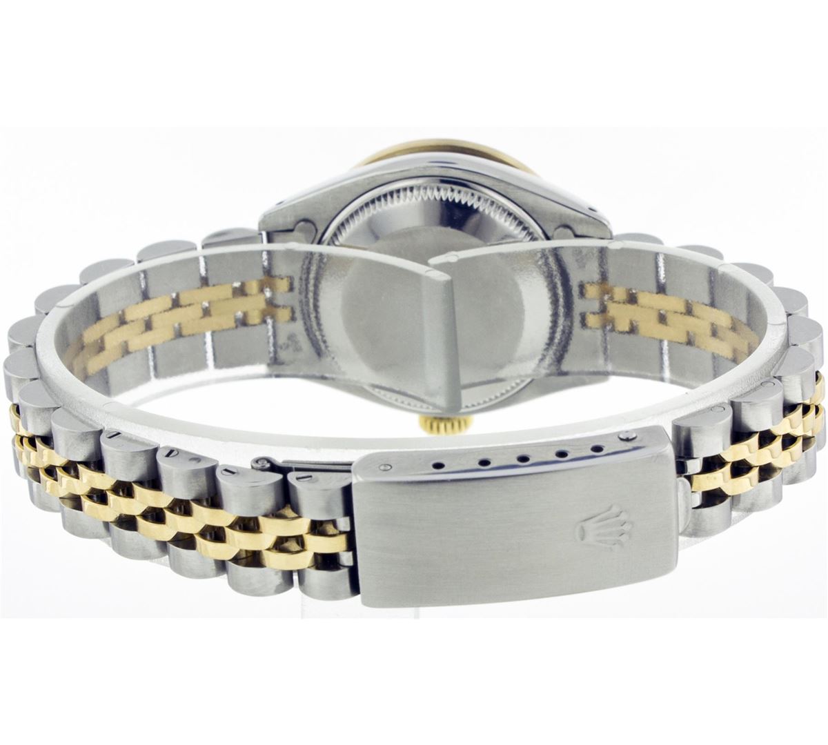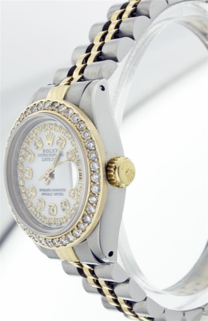 One Ladies Two Tone Rolex Datejust Polished, Serviced & Electronically Tested, 14K Yellow Gold & Stainless Steel Case:26mm, 14K Yellow Gold Crown, Custom Bezel: 18K Yellow Gold Beadset Diamond Bezel, Diamond Count: 32 Diamonds Total Weight .70 Carat, Clarity: Si-VS, Color: G to H. Custom Crystal: Synthetic Sapphire Cyclops Lens. Movement: Automatic Winding Movement Caliber 2030. Custom Dial: Mother Of Pearl String Diamond Dial, Diamond Count: 43 Diamonds, Clarity: SI-VS, Color: G to H. Date Window: 3 O'Clock Position Date Display, Non Quickset, Model: 6917 Condition: G-6 Extra Fine. Bracelet: Two Tone 14K Yellow Gold & Stainless Steel Jubilee. Bright Polish. 5.5 Inch Length, Adjustable. Standard Clasp, With Rolex Logo.