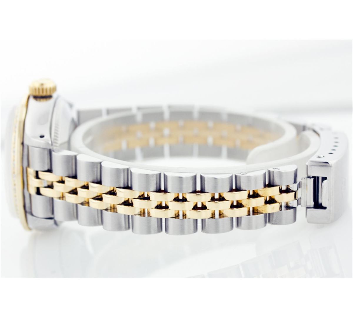 One Ladies Two Tone Rolex Datejust Polished, Serviced & Electronically Tested, 14K Yellow Gold & Stainless Steel Case:26mm, 14K Yellow Gold Crown, Custom Bezel: 18K Yellow Gold Beadset Diamond Bezel, Diamond Count: 32 Diamonds Total Weight .70 Carat, Clarity: Si-VS, Color: G to H. Custom Crystal: Synthetic Sapphire Cyclops Lens. Movement: Automatic Winding Movement Caliber 2030. Custom Dial: Mother Of Pearl Roman Dial. Date Window: 3 O'Clock Position Date Display, Non Quickset, Model: 6917 Condition: G-6 Extra Fine. Bracelet: Two Tone 14K Yellow Gold & Stainless Steel Jubilee. Bright Polish. 5.5 Inch Length, Adjustable. Standard Clasp, With Rolex Logo.