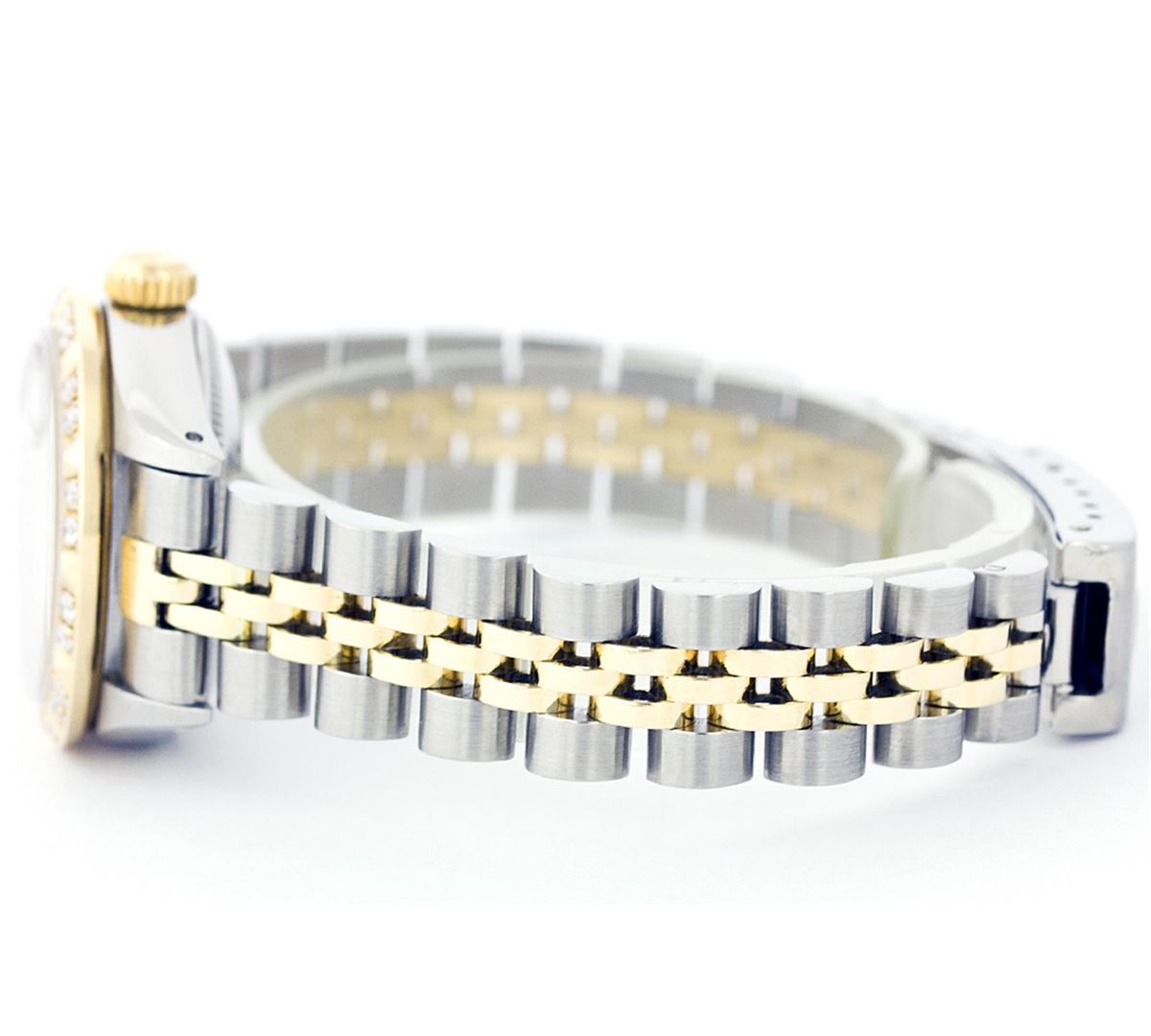 One Ladies Two Tone Rolex Datejust Polished, Serviced & Electronically Tested, 14K Yellow Gold & Stainless Steel Case:26mm, 14K Yellow Gold Crown, Custom Bezel: 18K Yellow Gold Pyramid Diamond Bezel, Diamond Count: 24 Diamonds Total Weight .50 Carat, Clarity: Si-VS, Color: G to H. Custom Crystal: Synthetic Sapphire Cyclops Lens. Movement: Automatic Winding Movement Caliber 2030. Custom Dial: Slate Grey With Roman Hour Markers. Date Window: 3 O'Clock Position Date Display, Non Quickset, Model: 6917 Condition: G-6 Extra Fine. Bracelet: Two Tone 14K Yellow Gold & Stainless Steel Jubilee. Bright Polish. 5.5 Inch Length, Adjustable. Standard Clasp, With Rolex Logo.