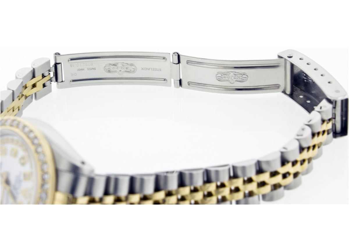 One Ladies Two Tone Rolex Datejust Polished, Serviced & Electronically Tested, 14K Yellow Gold & Stainless Steel Case:26mm, 14K Yellow Gold Crown, Custom Bezel: 18K Yellow Gold Beadset Diamond Bezel, Diamond Count: 32 Diamonds Total Weight .70 Carat, Clarity: Si-VS, Color: G to H. Custom Crystal: Synthetic Sapphire Cyclops Lens. Movement: Automatic Winding Movement Caliber 2030. Custom Dial: Mother Of Pearl String Diamond Dial, Diamond Count: 43 Diamonds, Clarity: SI-VS, Color: G to H. Date Window: 3 O'Clock Position Date Display, Non Quickset, Model: 6917 Condition: G-6 Extra Fine. Bracelet: Two Tone 14K Yellow Gold & Stainless Steel Jubilee. Bright Polish. 5.5 Inch Length, Adjustable. Standard Clasp, With Rolex Logo.