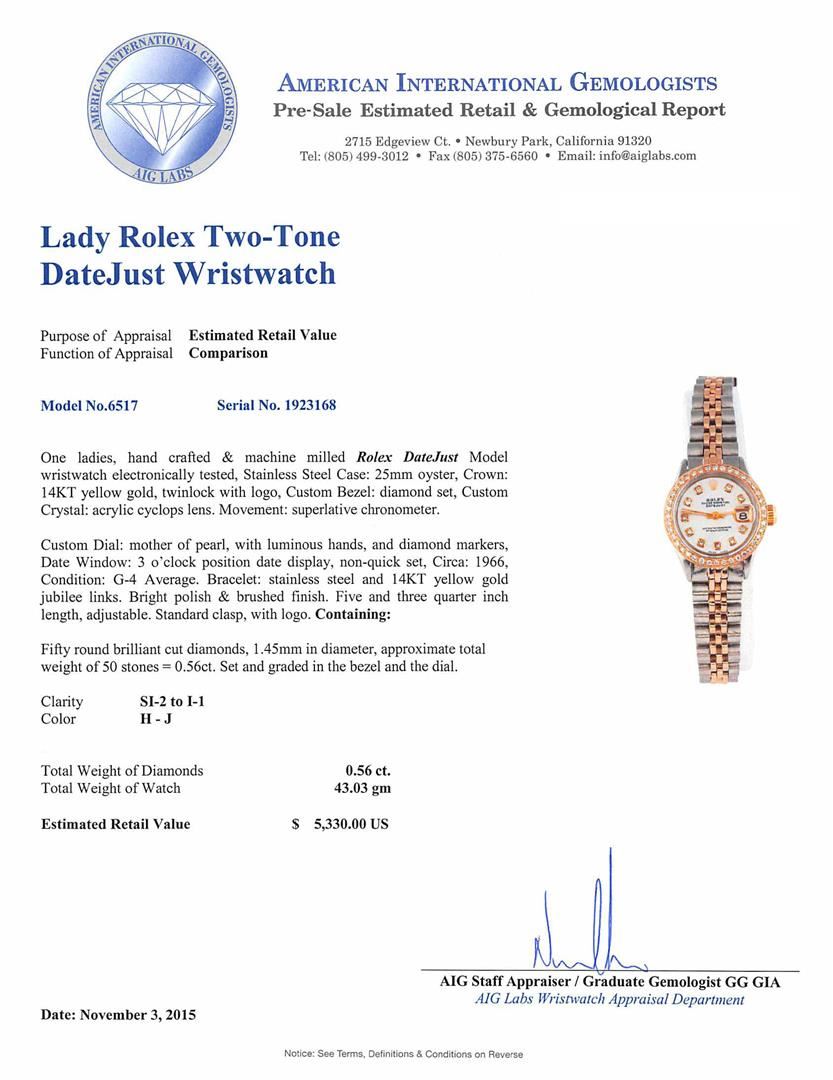 One ladies, hand crafted & machine milled Rolex DateJust Model wristwatch electronically tested, Stainless Steel Case: 25mm oyster, Crown: 14KT yellow gold, twinlock with logo, Custom Bezel: diamond set, Custom Crystal: acrylic cyclops lens. Movement: superlative chronometer. Custom Dial: mother of pearl, with luminous hands, and diamond markers, Date Window: 3 o'clock position date display, non-quick set. Circa: 1966, Condition: G-4 Average. Bracelet: stainless steel and 14KT yellow gold jubilee links. Bright polish & brushed finish. Five and three quarter inch length, adjustable. Standard clasp, with logo. Diamond Info: Total of fifty round brilliant cut diamonds, 1.45mm in diameter, approximate total weight of 50 stones = 0.56ct. Set and graded in the bezel and the dial. Clarity: SI-2 to I-1. Color: H-J. Total Weight of Diamonds: 0.56ct. Total Weight of Watch: 43.03 grams. AIG Appraised at $5,330.00.