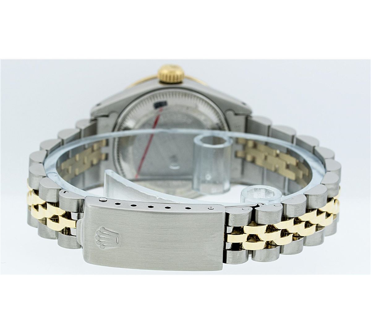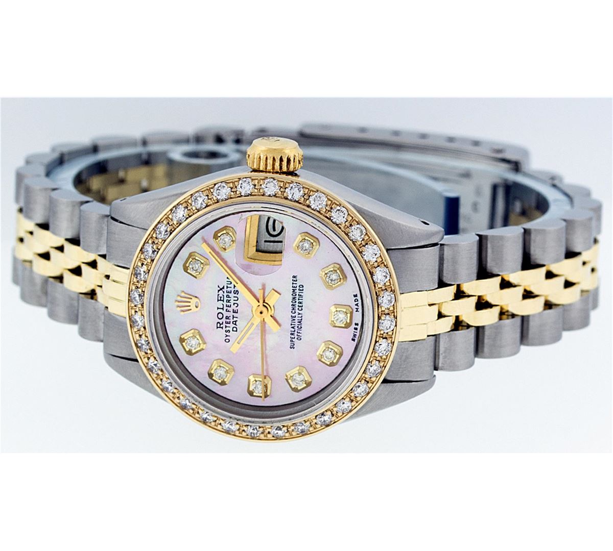 One Ladies Two Tone Rolex Datejust Polished, Serviced & Electronically Tested, 14K Yellow Gold & Stainless Steel Case:26mm, 14K Yellow Gold Crown, Custom Bezel: 18K Yellow Gold Beadset Diamond Bezel, Diamond Count: 32 Diamonds, Total Weight .70 Carat, Clarity: Si-VS, Color: G to H. Custom Crystal: Synthetic Sapphire Cyclops Lens. Movement: Automatic Winding Movement Caliber 2030. Custom Dial: Light Pink Mother Of Pearl Diamond Dial, Diamond Count: 10 Diamonds in Dial. Date Window: 3 O'Clock Position Date Display, Model: Datejust Condition: G-6 Extra Fine. Bracelet: Two Tone 14K Yellow Gold & Stainless Steel Jubilee. Bright Polish. 6.0 Inch Length, Adjustable. Standard Clasp, With Rolex Logo. Comes with 6 month warranty.