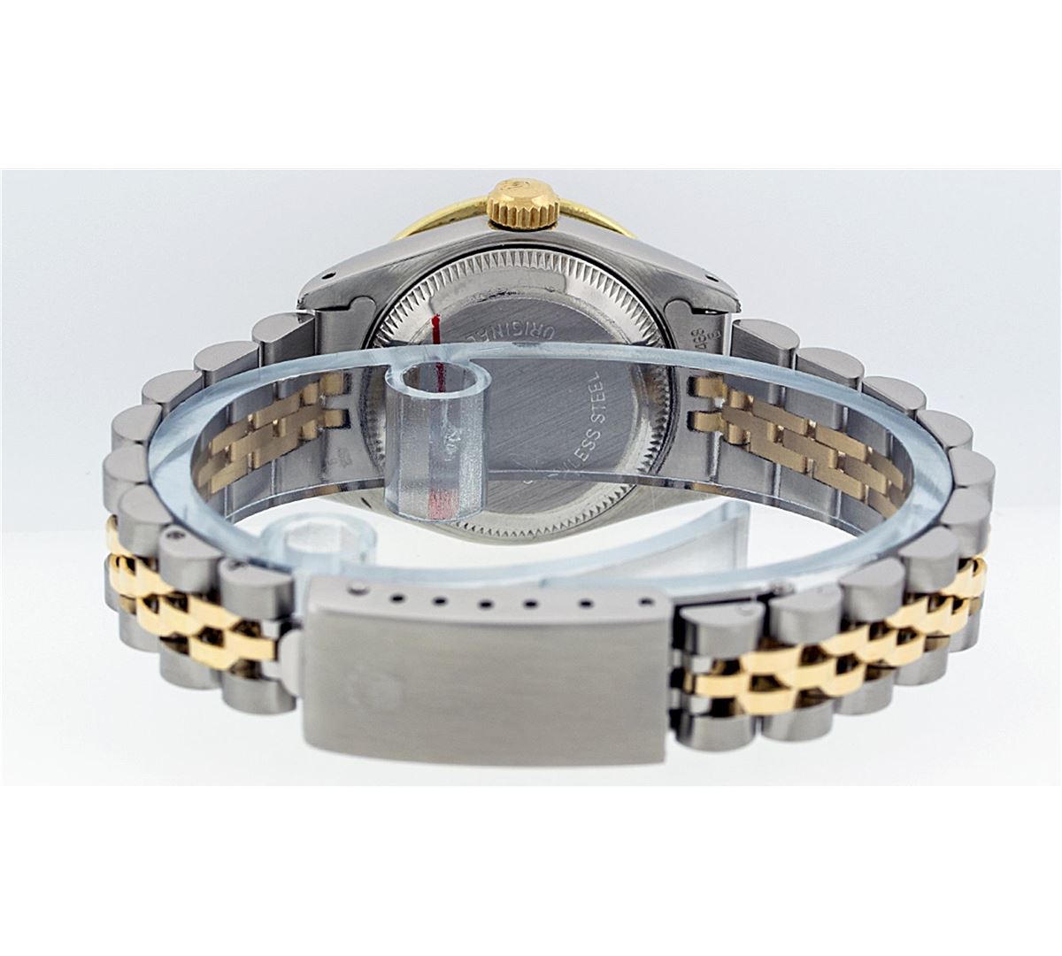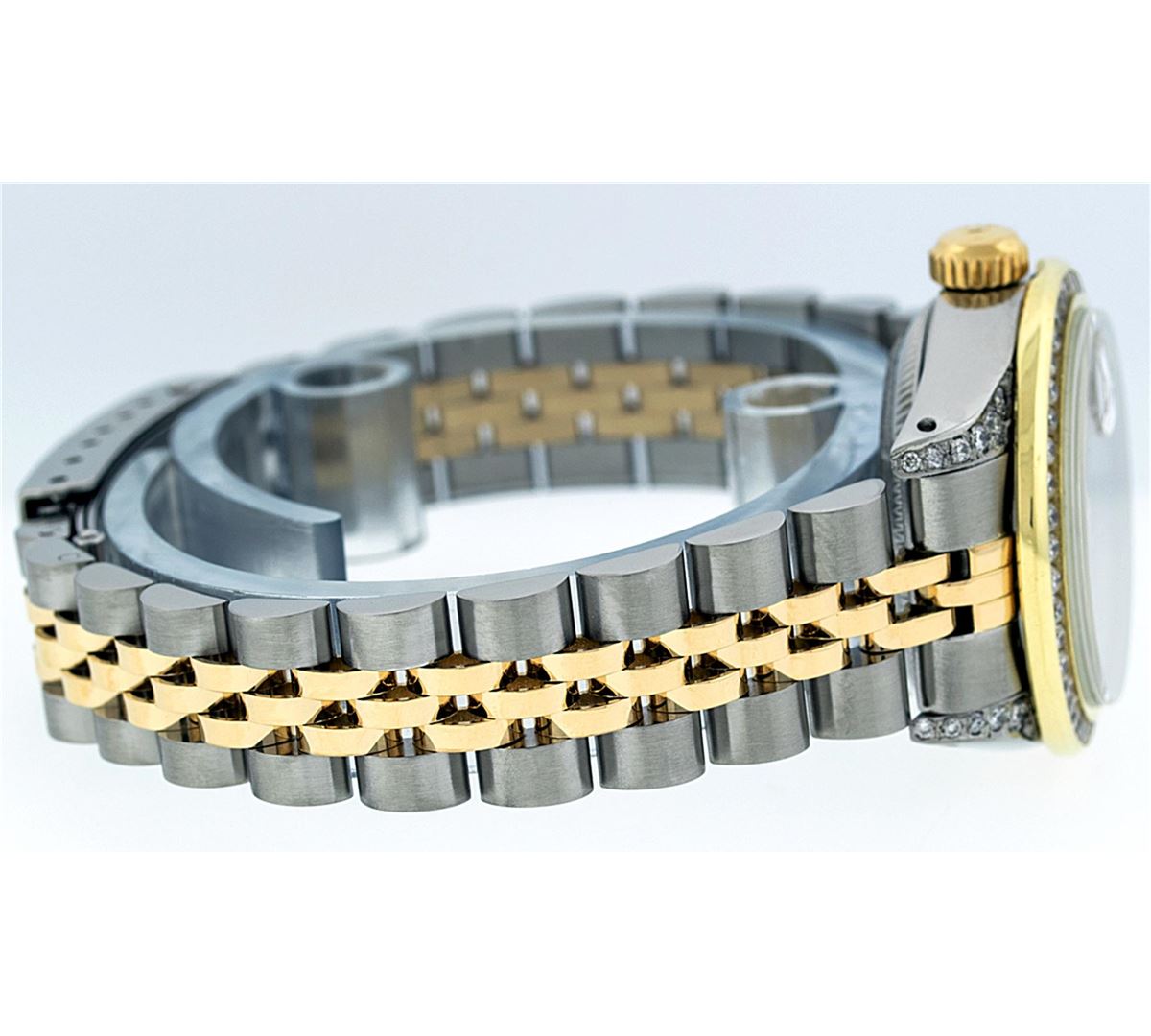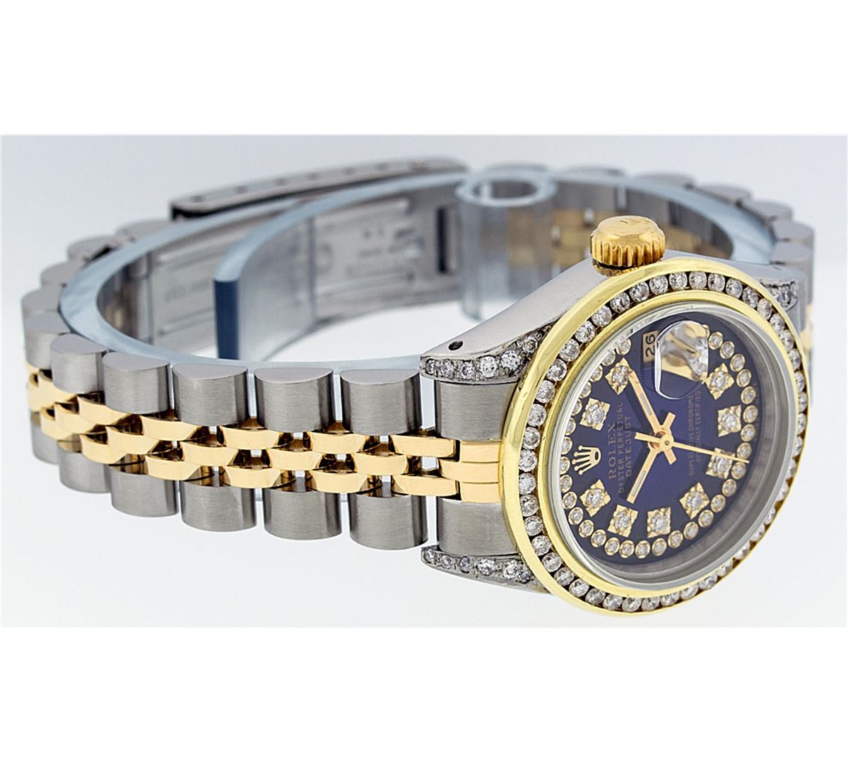 One Ladies Rolex Datejust Polished Bright with Satin Finish, Serviced & Electronically Tested, Stainless Steel Case:26mm, 14K Yellow Gold Crown, Diamond Lugs: 16 Diamonds On Lugs, Clarity: SI-VS, Color: G to H. Custom Bezel: 18K Yellow Gold Channel Set Bezel, Diamond Count: 44 Diamonds, Total Weight 1.00 Carat, Clarity: SI-VS, Color: G to H. Custom Crystal: Synthetic Sapphire Cyclops Lens. Movement: Automatic Winding Movement Caliber 2030. Custom Dial: Refinished Blue Vignette With Diamond Dial, 43 Diamonds in Dial G To H In Color, Clarity: VVS. Date Window: 3 O'Clock Position Date Display, Model: Datejust Condition: G-6 Extra Fine. Bracelet: 14K Yellow Gold And Stainless Steel Jubilee Band. Bright Polish & Satin Finish. 6.0 Inch Length, Adjustable. Standard Clasp, With Rolex Logo.