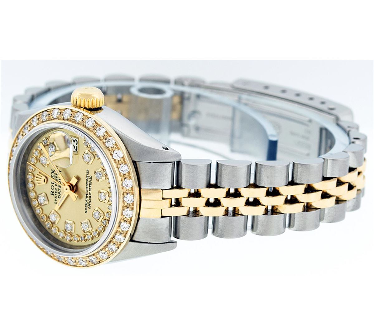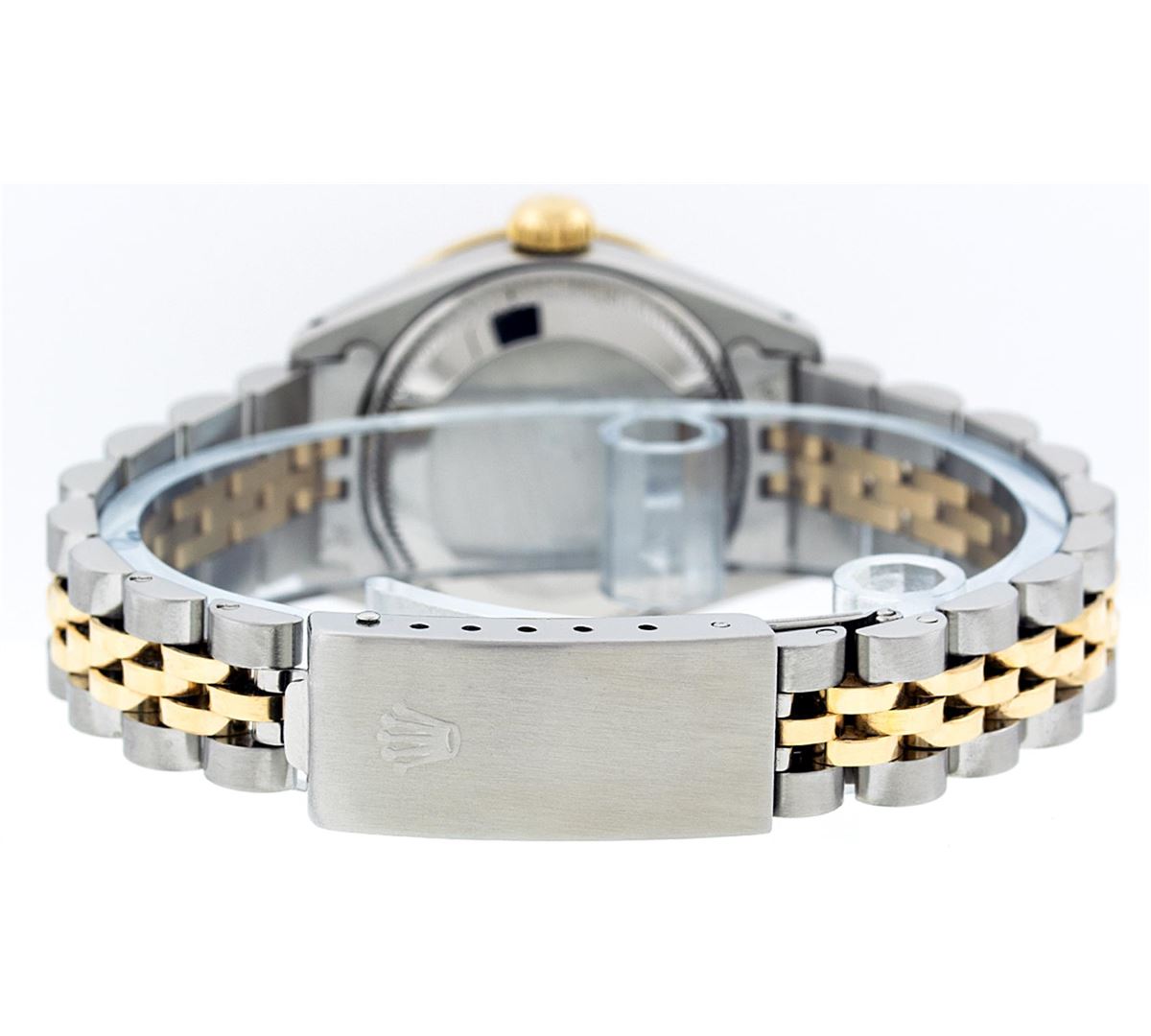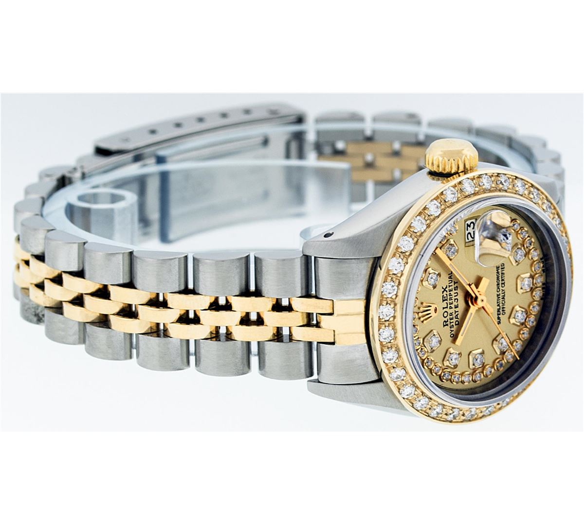 One Ladies Two Tone Rolex Datejust Polished, Serviced & Electronically Tested, 14K Yellow Gold & Stainless Steel Case:26mm, 14K Yellow Gold Crown, Custom Bezel: 18K Yellow Gold Beadset Diamond Bezel, Diamond Count: 32 Diamonds Total Weight .70 Carat, Clarity: Si-VS, Color: G to H. Custom Crystal: Synthetic Sapphire Cyclops Lens. Movement: Automatic Winding Movement Caliber 2030. Custom Dial: Champagne String Diamond Dial, Diamond Count: 43 Diamonds, Clarity: SI-VS, Color: G to H. Date Window: 3 O'Clock Position Date Display, Non Quickset, Model: Datejust. Condition: G-6 Extra Fine. Bracelet: Two Tone 14K Yellow Gold & Stainless Steel Jubilee. Bright Polish. 6.0 Inch Length, Adjustable. Standard Clasp, With Rolex Logo.