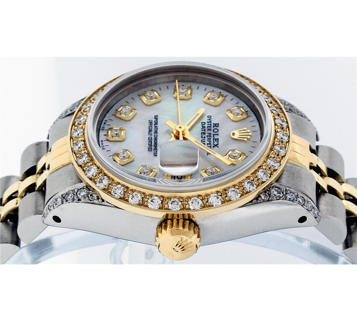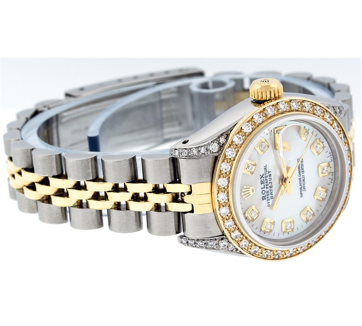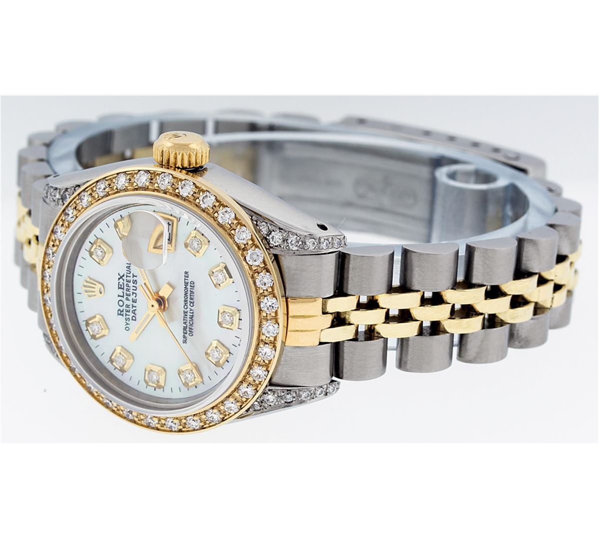 One Ladies Two Tone Rolex Datejust Polished, Serviced & Electronically Tested, 14K Yellow Gold & Stainless Steel Case:26mm, 14K Yellow Gold Crown, Diamond Lugs, Clarity SI-VS, Color: G to H. Custom Bezel: 18K Yellow Gold Beadset Diamond Bezel, Diamond Count: 32 Diamonds Total Weight .70 Carat, Clarity: Si-VS, Color: G to H. Custom Crystal: Synthetic Sapphire Cyclops Lens. Movement: Automatic Winding Movement Caliber 2030. Custom Dial: Mother Of Pearl With Diamond Hour Markers, Diamond Count: 10 Diamonds, Clarity: SI-VS, Color: G to H. Date Window: 3 O'Clock Position Date Display, Non Quickset, Model: Datejust. Condition: G-6 Extra Fine. Bracelet: Two Tone 14K Yellow Gold & Stainless Steel Jubilee. Bright Polish. 6.0 Inch Length, Adjustable. Standard Clasp, With Rolex Logo.