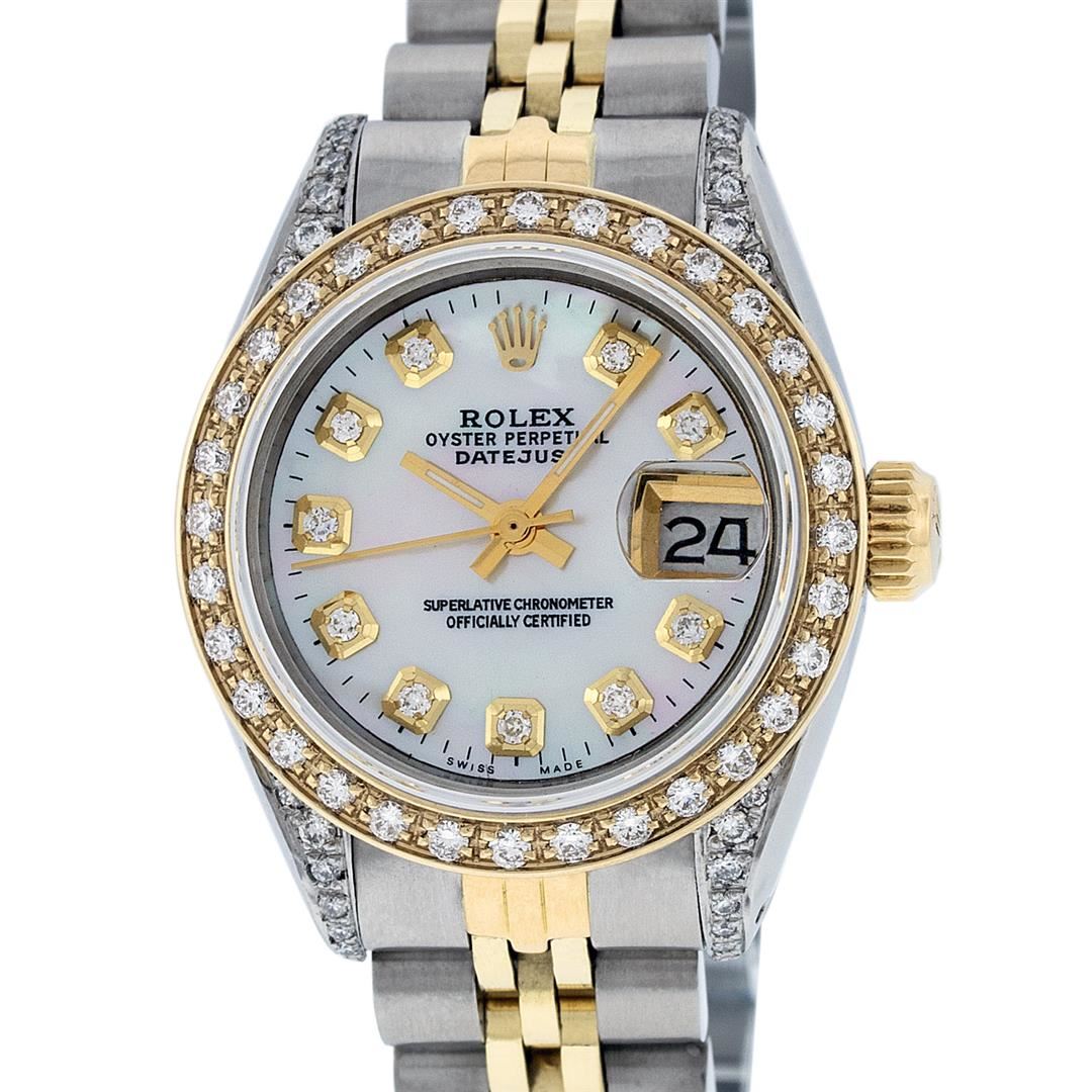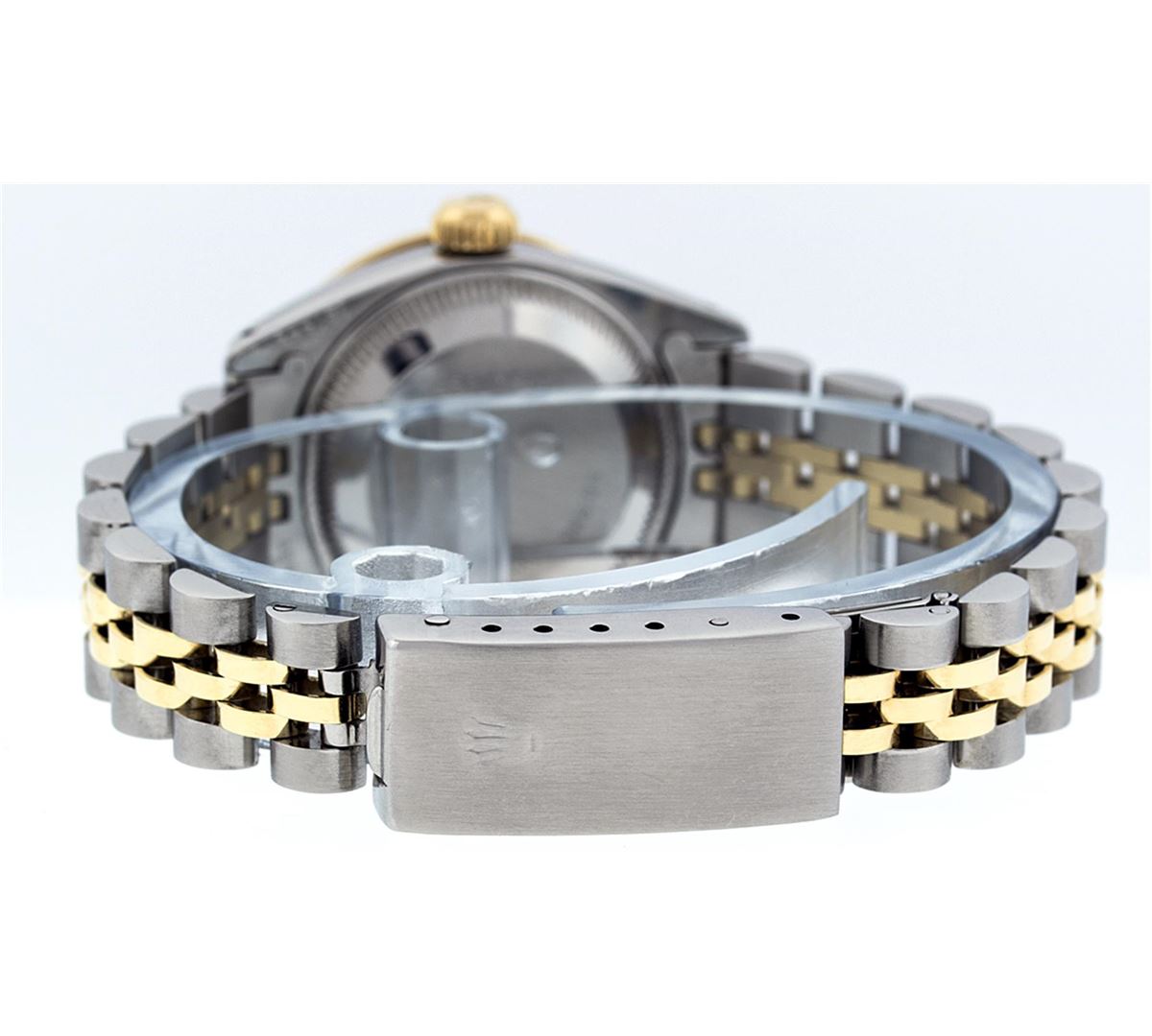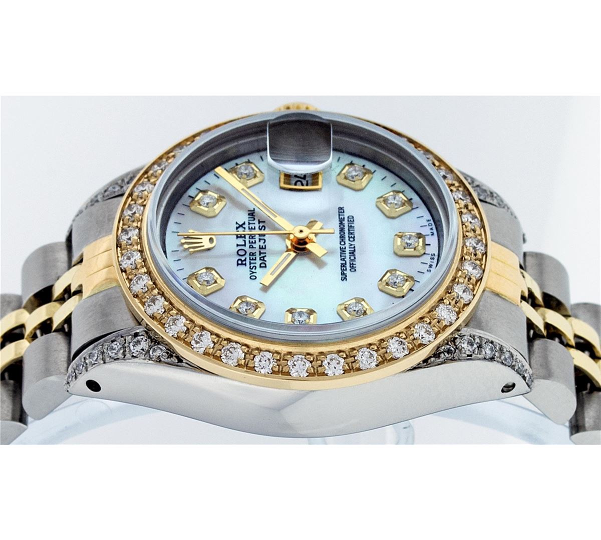 One Ladies Two Tone Rolex Datejust Polished, Serviced & Electronically Tested, 14K Yellow Gold & Stainless Steel Case:26mm, 14K Yellow Gold Crown, Diamond Lugs, Clarity SI-VS, Color: G to H. Custom Bezel: 18K Yellow Gold Beadset Diamond Bezel, Diamond Count: 32 Diamonds Total Weight .70 Carat, Clarity: Si-VS, Color: G to H. Custom Crystal: Synthetic Sapphire Cyclops Lens. Movement: Automatic Winding Movement Caliber 2030. Custom Dial: Mother Of Pearl With Diamond Hour Markers, Diamond Count: 10 Diamonds, Clarity: SI-VS, Color: G to H. Date Window: 3 O'Clock Position Date Display, Non Quickset, Model: Datejust. Condition: G-6 Extra Fine. Bracelet: Two Tone 14K Yellow Gold & Stainless Steel Jubilee. Bright Polish. 6.0 Inch Length, Adjustable. Standard Clasp, With Rolex Logo.