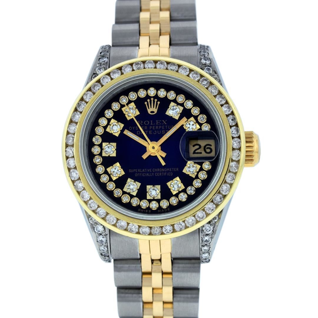 One Ladies Rolex Datejust Polished Bright with Satin Finish, Serviced & Electronically Tested, Stainless Steel Case:26mm, 14K Yellow Gold Crown, Diamond Lugs: 16 Diamonds On Lugs, Clarity: SI-VS, Color: G to H. Custom Bezel: 18K Yellow Gold Channel Set Bezel, Diamond Count: 44 Diamonds, Total Weight 1.00 Carat, Clarity: SI-VS, Color: G to H. Custom Crystal: Synthetic Sapphire Cyclops Lens. Movement: Automatic Winding Movement Caliber 2030. Custom Dial: Refinished Blue Vignette With Diamond Dial, 43 Diamonds in Dial G To H In Color, Clarity: VVS. Date Window: 3 O'Clock Position Date Display, Model: Datejust Condition: G-6 Extra Fine. Bracelet: 14K Yellow Gold And Stainless Steel Jubilee Band. Bright Polish & Satin Finish. 6.0 Inch Length, Adjustable. Standard Clasp, With Rolex Logo.