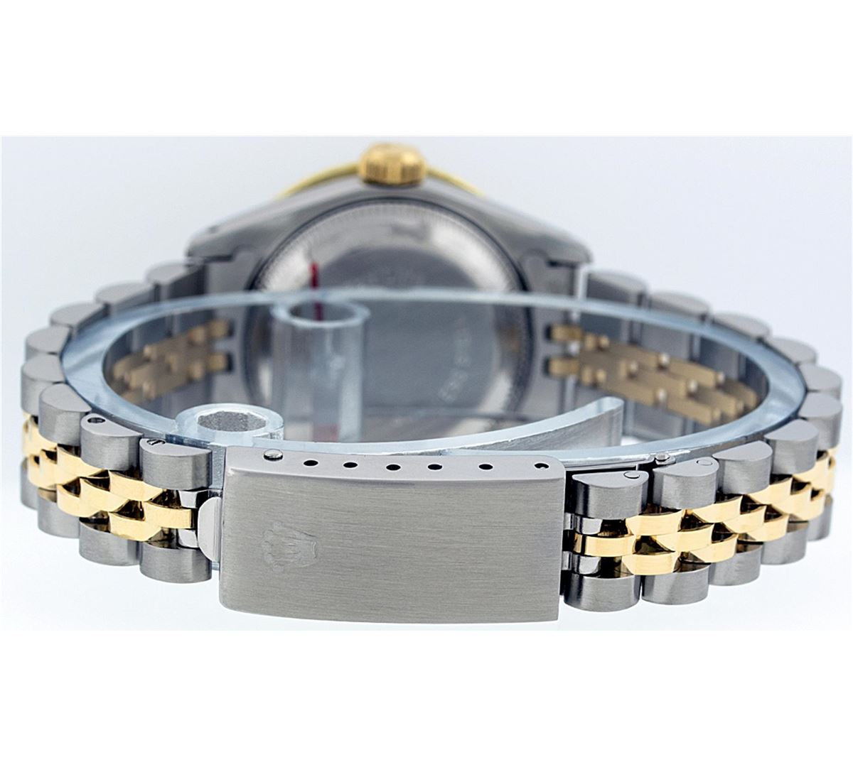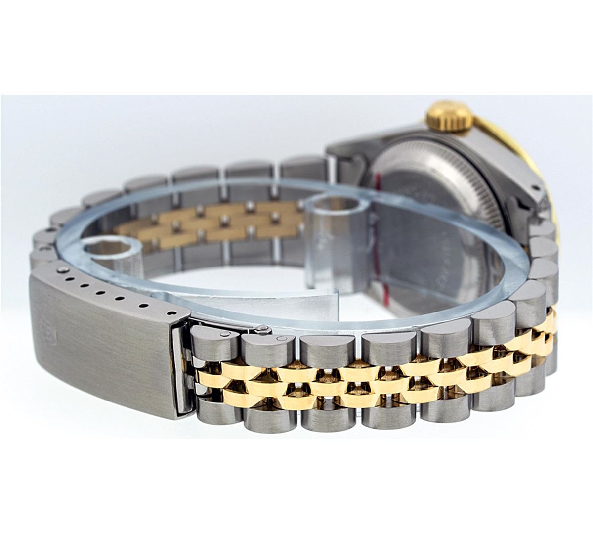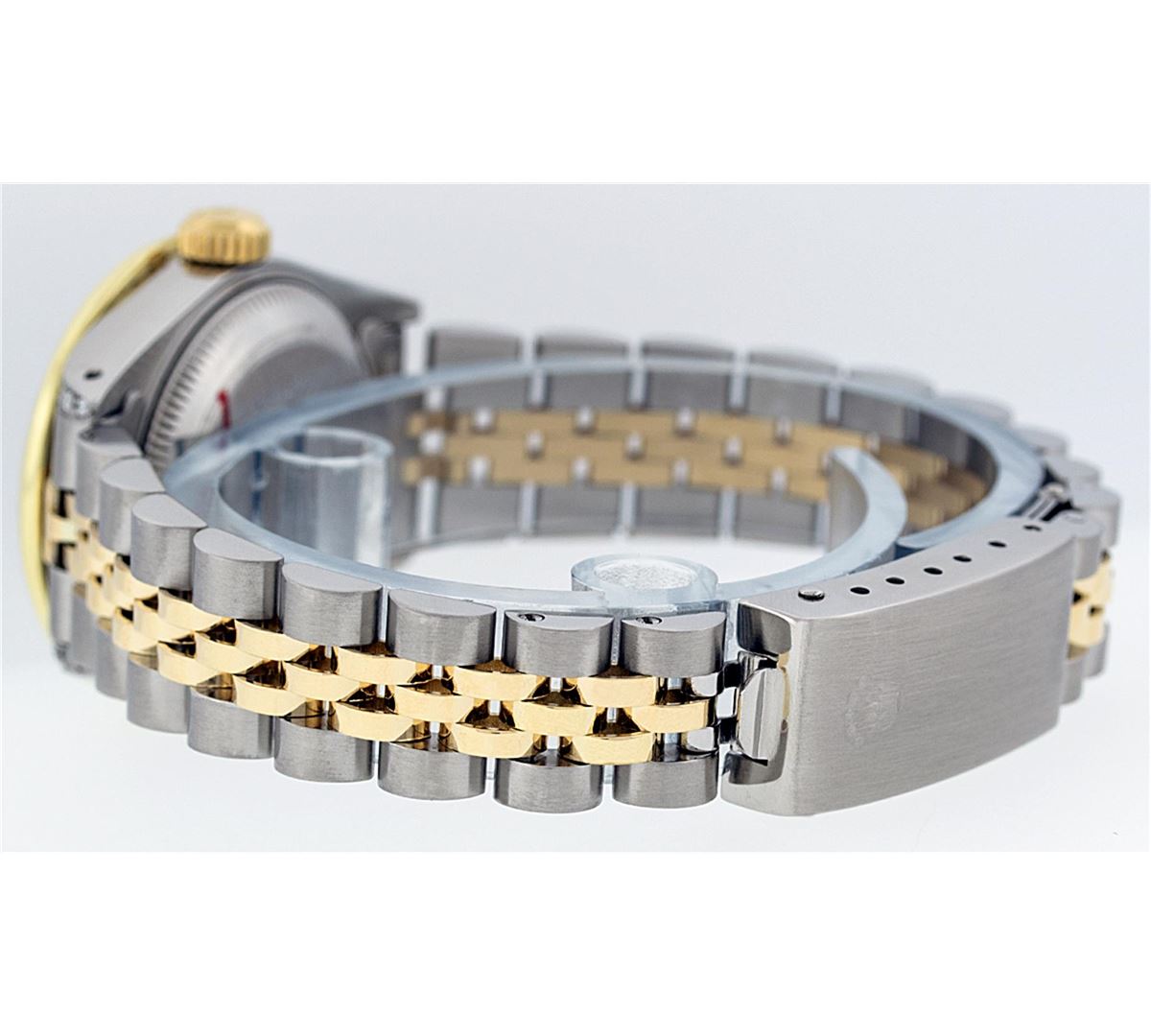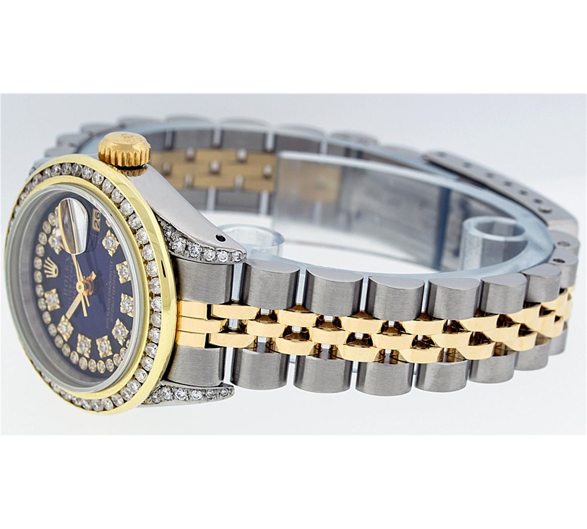 One Ladies Rolex Datejust Polished Bright with Satin Finish, Serviced & Electronically Tested, Stainless Steel Case:26mm, 14K Yellow Gold Crown, Diamond Lugs: 16 Diamonds On Lugs, Clarity: SI-VS, Color: G to H. Custom Bezel: 18K Yellow Gold Channel Set Bezel, Diamond Count: 44 Diamonds, Total Weight 1.00 Carat, Clarity: SI-VS, Color: G to H. Custom Crystal: Synthetic Sapphire Cyclops Lens. Movement: Automatic Winding Movement Caliber 2030. Custom Dial: Refinished Blue Vignette With Diamond Dial, 43 Diamonds in Dial G To H In Color, Clarity: VVS. Date Window: 3 O'Clock Position Date Display, Model: Datejust Condition: G-6 Extra Fine. Bracelet: 14K Yellow Gold And Stainless Steel Jubilee Band. Bright Polish & Satin Finish. 6.0 Inch Length, Adjustable. Standard Clasp, With Rolex Logo.