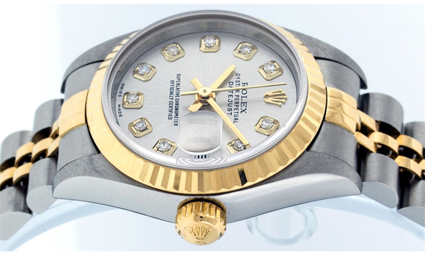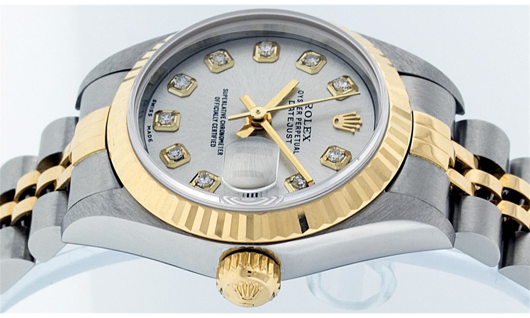 One Ladies Two Tone No Hole Quickset Rolex Datejust Polished, Serviced & Electronically Tested, 18K Yellow Gold & Stainless Steel Case:26mm, 18K Yellow Gold Crown, Bezel: 18K Yellow Gold Fluted Bezel. Custom Crystal: Sapphire Cyclops Lens. Movement: Automatic Winding Movement Caliber 2235. Custom Dial: Silver Diamond Dial. Date Window: 3 O'Clock Position Date Display, Model: No Hole Quickset Datejust. Condition: G-6 Extra Fine. Bracelet: Two Tone 18K Yellow Gold & Stainless Steel Jubilee Band. Bright Polish. 6.0 Inch Length, Adjustable. Standard Clasp, With Rolex Logo.