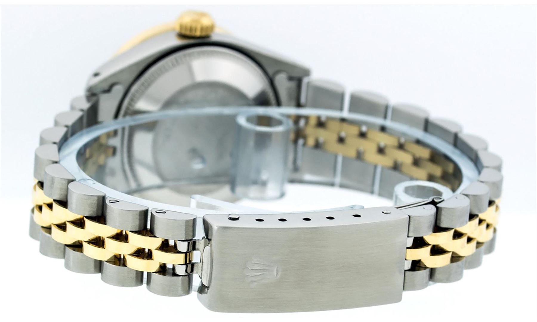 One Ladies Two Tone Rolex Datejust Polished, Serviced & Electronically Tested, 14K Yellow Gold & Stainless Steel Case:26mm, 14K Yellow Gold Crown, Custom Bezel: 18K Yellow Gold Pyramid Diamond Bezel, Diamond Count: 24 Diamonds In Bezel. Total Weight .50 Carat, Clarity: Si-VS, Color: G to H. Custom Crystal: Synthetic Sapphire Cyclops Lens. Movement: Automatic Winding Movement Caliber 2030. Custom Dial: Slate Grey With Roman Hour Markers. Date Window: 3 O'Clock Position Date Display, Model: Datejust. Condition: G-6 Extra Fine The Watch Is In Very Good Condition Free Of All Scratches And Dents. . Bracelet: Two Tone 14K Yellow Gold & Stainless Steel Jubilee. Bright Polish. 6.0 Inch Length, Adjustable. Standard Clasp, With Rolex Logo.