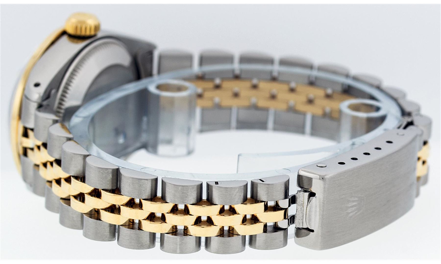 One Ladies Two Tone Rolex Datejust Polished, Serviced & Electronically Tested, 14K Yellow Gold & Stainless Steel Case: 26mm, 14K Yellow Gold Crown, Custom Bezel: 18K Yellow Gold Beadset Diamond Bezel, Diamond Count: 32 Diamonds Total Weight .70 Carat, Clarity: Si-VS, Color: G to H. Custom Crystal: Synthetic Sapphire Cyclops Lens. Movement: Automatic Winding Movement Caliber 2030. Custom Dial: Silver Dial Set With Diamond Hour Markers, 10 Diamond in Dial G To H In Color, Si-VS Clarity. Date Window: 3 O'Clock Position Date Display, Non Quickset, Model: Datejust. Condition: G-6 Extra Fine. Bracelet: Two Tone 14K Yellow Gold & Stainless Steel Jubilee. Bright Polish. 6.0 Inch Length, Adjustable. Standard Clasp, With Rolex Logo.