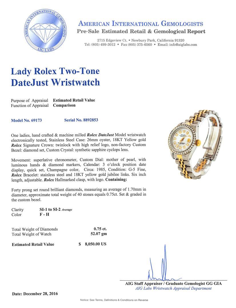One ladies, hand crafted & machine milled Rolex DateJust Model wristwatch electronically tested, Stainless Steel Case: 26mm oyster, 18KT Yellow gold Rolex Signature Crown: twinlock with high relief logo, non-factory Custom Bezel: diamond set, Custom Crystal: synthetic sapphire cyclops lens. Movement: superlative chronometer, Custom Dial: mother of pearl, with luminous hands & diamond markers, Calendar: 3 o'clock position date display, quick set, Champagne color, Circa: 1985, Condition: G-5 Fine, Rolex Bracelet: stainless steel and 18KT yellow gold jubilee links. Six inch length, adjustable. Rolex Hallmarked clasp, with logo. Containing: Forty prong set round brilliant diamonds, measuring an average of 1.70mm in diameter, approximate total weight of 40 stones equals 0.75ct. Set & graded in the custom bezel. Clarity: SI-1 to SI-2 Average Color F - H. Total Weight of Diamonds 0.75ct. Total Weight of Watch 52.07gm. AIG Appraised at $8,050.00.