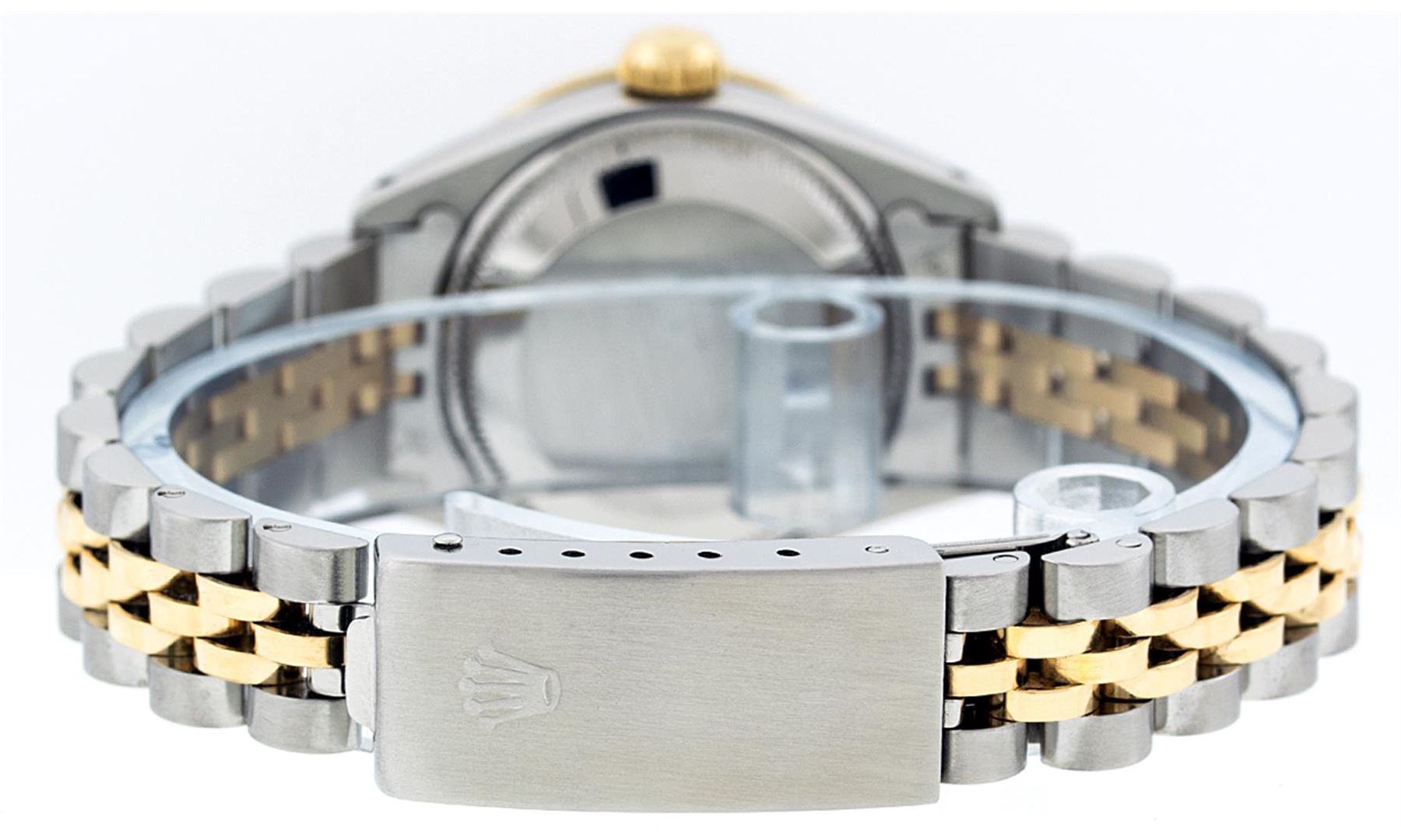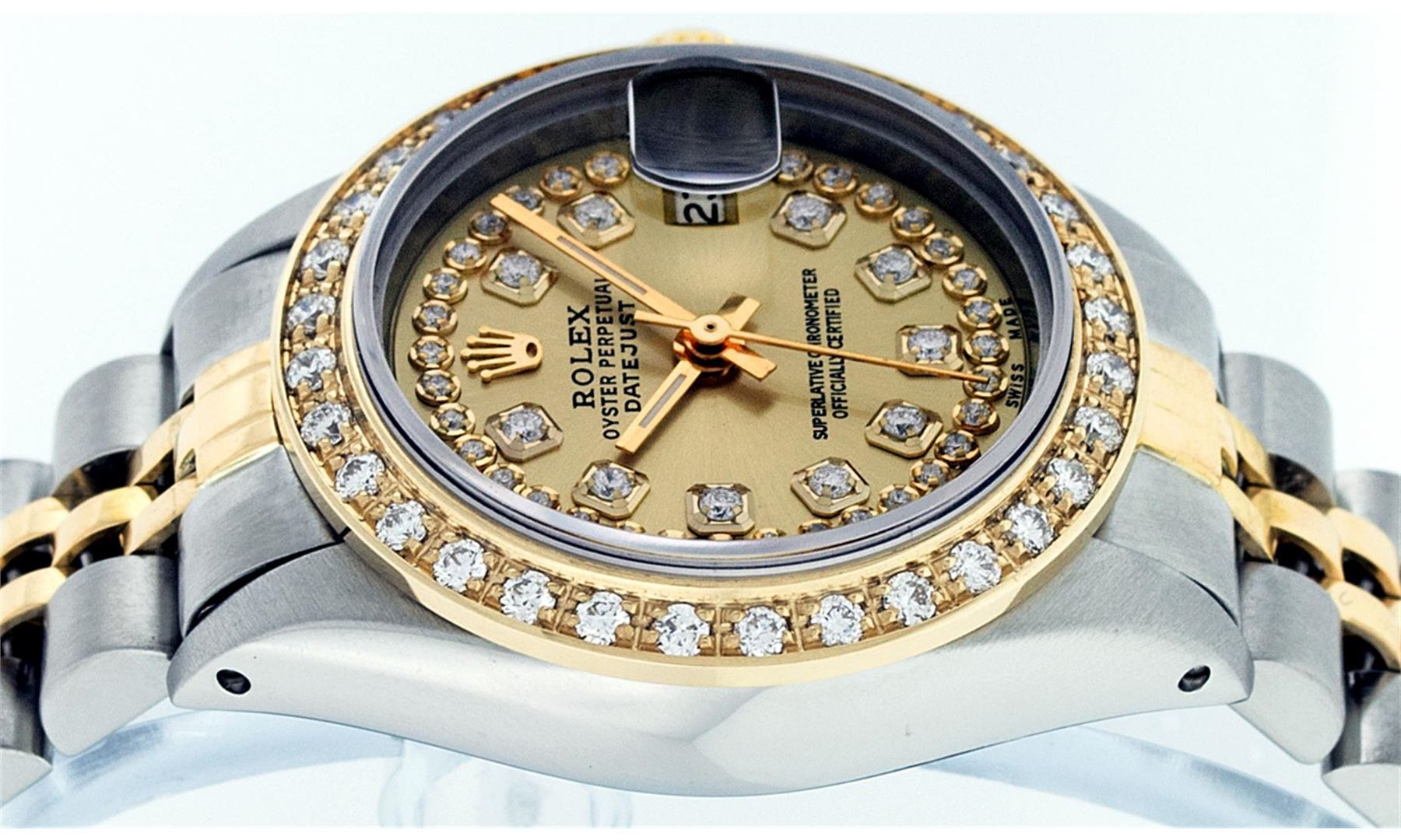 One Ladies Two Tone Rolex Datejust Polished, Serviced & Electronically Tested, 14K Yellow Gold & Stainless Steel Case:26mm, 14K Yellow Gold Crown, Custom Bezel: 18K Yellow Gold Beadset Diamond Bezel, Diamond Count: 32 Diamonds Total Weight .70 Carat, Clarity: Si-VS, Color: G to H. Custom Crystal: Synthetic Sapphire Cyclops Lens. Movement: Automatic Winding Movement Caliber 2030. Custom Dial: Champagne String Diamond Dial, Diamond Count: 43 Diamonds, Clarity: SI-VS, Color: G to H. Date Window: 3 O'Clock Position Date Display, Non Quickset, Model: Datejust. Condition: G-6 Extra Fine. Bracelet: Two Tone 14K Yellow Gold & Stainless Steel Jubilee. Bright Polish. 6.0 Inch Length, Adjustable. Standard Clasp, With Rolex Logo.