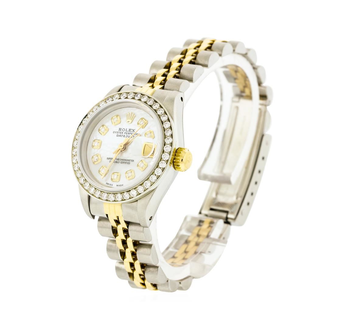 One ladies, hand crafted & machine milled Rolex DateJust Model wristwatch electronically tested, Stainless Steel Case: 26mm oyster, 18KT Yellow gold Rolex Signature Crown: twinlock with high relief logo, non-factory Custom Bezel: diamond set, Custom Crystal: synthetic sapphire cyclops lens. Movement: superlative chronometer, Custom Dial: mother of pearl, with luminous hands & diamond markers, Calendar: 3 o'clock position date display, quick set, Champagne color, Circa: 1985, Condition: G-5 Fine, Rolex Bracelet: stainless steel and 18KT yellow gold jubilee links. Six inch length, adjustable. Rolex Hallmarked clasp, with logo. Containing: Forty prong set round brilliant diamonds, measuring an average of 1.70mm in diameter, approximate total weight of 40 stones equals 0.75ct. Set & graded in the custom bezel. Clarity: SI-1 to SI-2 Average Color F - H. Total Weight of Diamonds 0.75ct. Total Weight of Watch 52.07gm. AIG Appraised at $8,050.00.