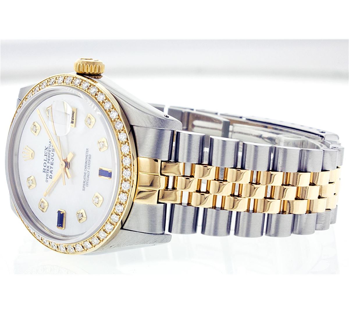 One Gents Two Tone Rolex Datejust Polished, Serviced & Electronically Tested, 14K Yellow Gold & Stainless Steel Case: 36mm, 14K Yellow Gold Crown, Custom Bezel: 18K Yellow Gold Beadset Diamond Bezel, Diamond Count: 44 Diamonds Total Weight 1.00 Carat, Clarity: Si-VS, Color: G to H. Custom Crystal: Synthetic Sapphire Cyclops Lens. Movement: Automatic Winding Movement Caliber 3035. Custom Dial: Mother Of Pearl Dial Set With Diamond Hour Markers, 8 Diamonds + 2 Sapphire Baguettes in Dial G To H In Color , Date Window: 3 O'Clock Position Date Display, Quickset, Model: 16013 Condition: G-6 Extra Fine. Bracelet: Two Tone 14K Yellow Gold & Stainless Steel Jubilee. Bright Polish. 6.5 Inch Length, Adjustable. Standard Clasp, With Rolex Logo.