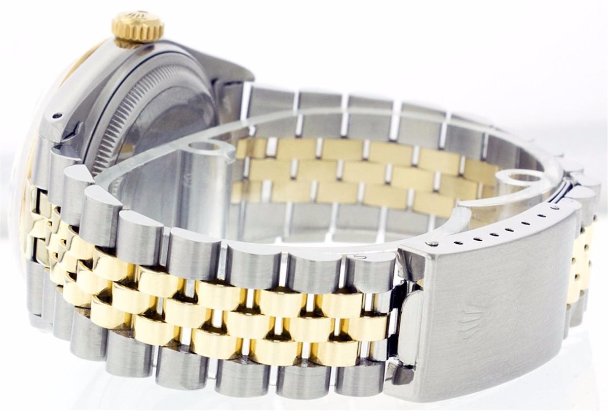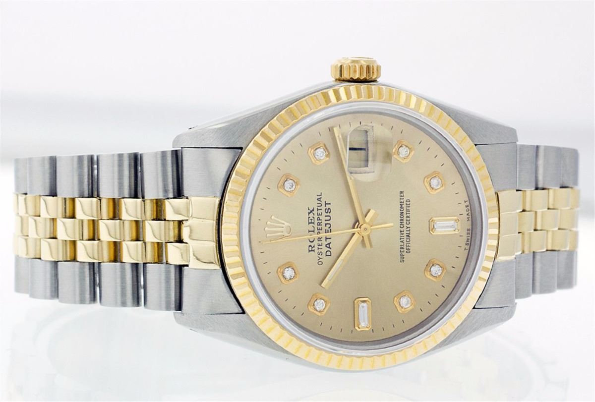 One Mens Two Tone Rolex Datejust Polished, Serviced & Electronically Tested, 14K Yellow Gold & Stainless Steel Case:36mm, 14K Yellow Gold Crown, Bezel: 18K Yellow Gold Fluted Bezel. Custom Crystal: Acrylic Cyclops Lens. Movement: Automatic Winding Movement Caliber 3035. Custom Dial: Champagne Dial Set With Diamond Hour Markers and Baguette Diamonds On The Six And Nine Hour Markers, 8 Diamonds + 2 Baguettes in Dial G To H In Color, Si-VS Clarity. Date Window: 3 O'Clock Position Date Display, Quickset, Model: 16013 Condition: G-6 Extra Fine. Bracelet:Two Tone 14K Yellow Gold & Stainless Steel Jubilee. Bright Polish. 6.5 Inch Length, Adjustable. Standard Clasp, With Rolex Logo.