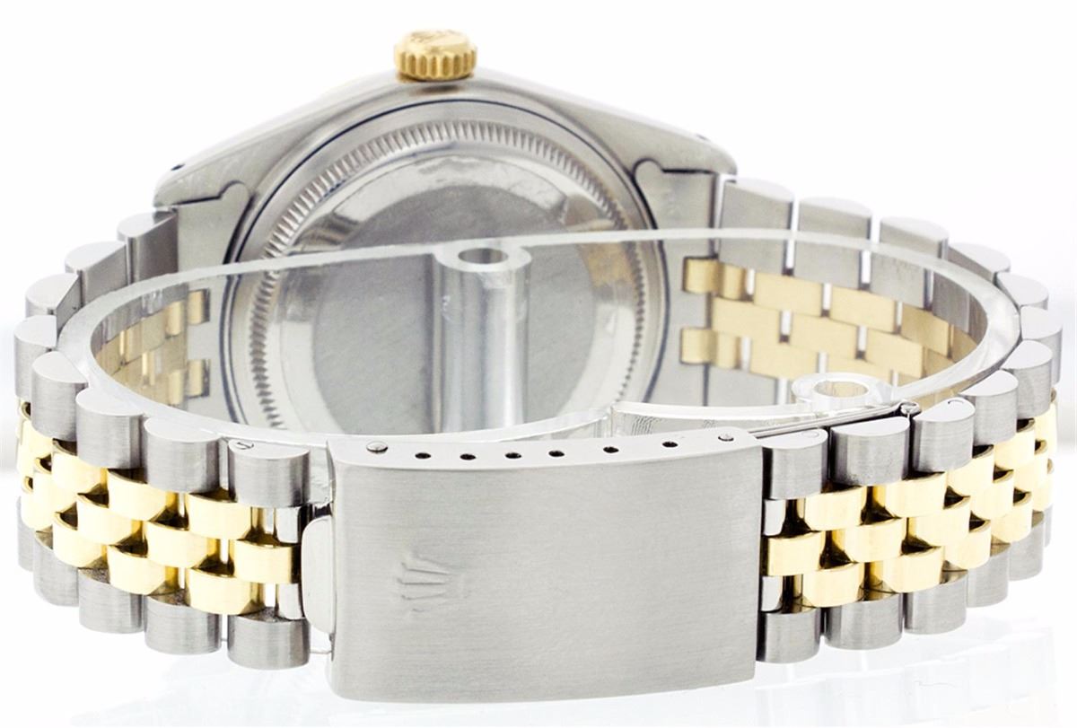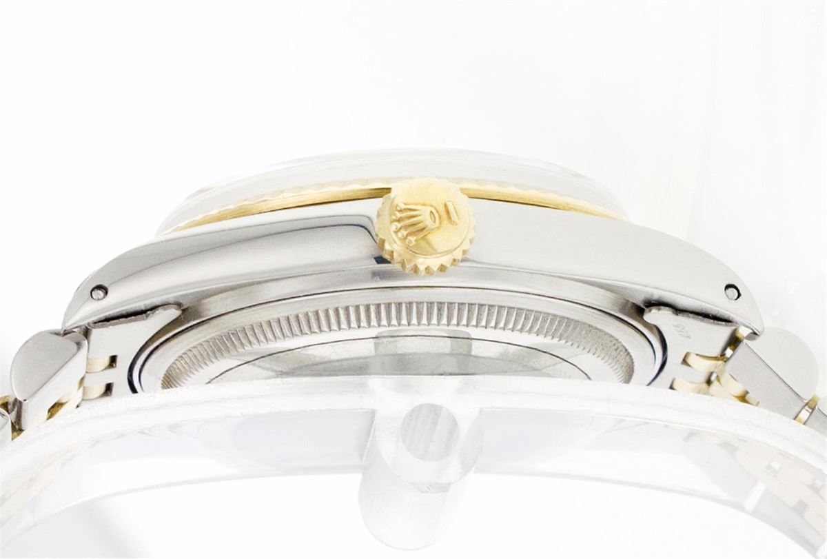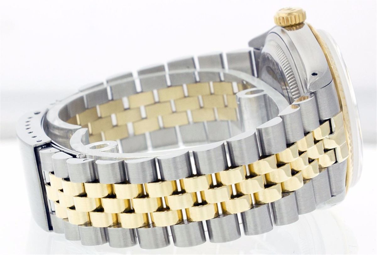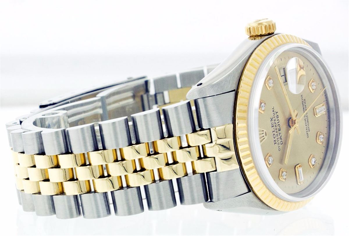One Mens Two Tone Rolex Datejust Polished, Serviced & Electronically Tested, 14K Yellow Gold & Stainless Steel Case:36mm, 14K Yellow Gold Crown, Bezel: 18K Yellow Gold Fluted Bezel. Custom Crystal: Acrylic Cyclops Lens. Movement: Automatic Winding Movement Caliber 3035. Custom Dial: Champagne Dial Set With Diamond Hour Markers and Baguette Diamonds On The Six And Nine Hour Markers, 8 Diamonds + 2 Baguettes in Dial G To H In Color, Si-VS Clarity. Date Window: 3 O'Clock Position Date Display, Quickset, Model: 16013 Condition: G-6 Extra Fine. Bracelet:Two Tone 14K Yellow Gold & Stainless Steel Jubilee. Bright Polish. 6.5 Inch Length, Adjustable. Standard Clasp, With Rolex Logo.