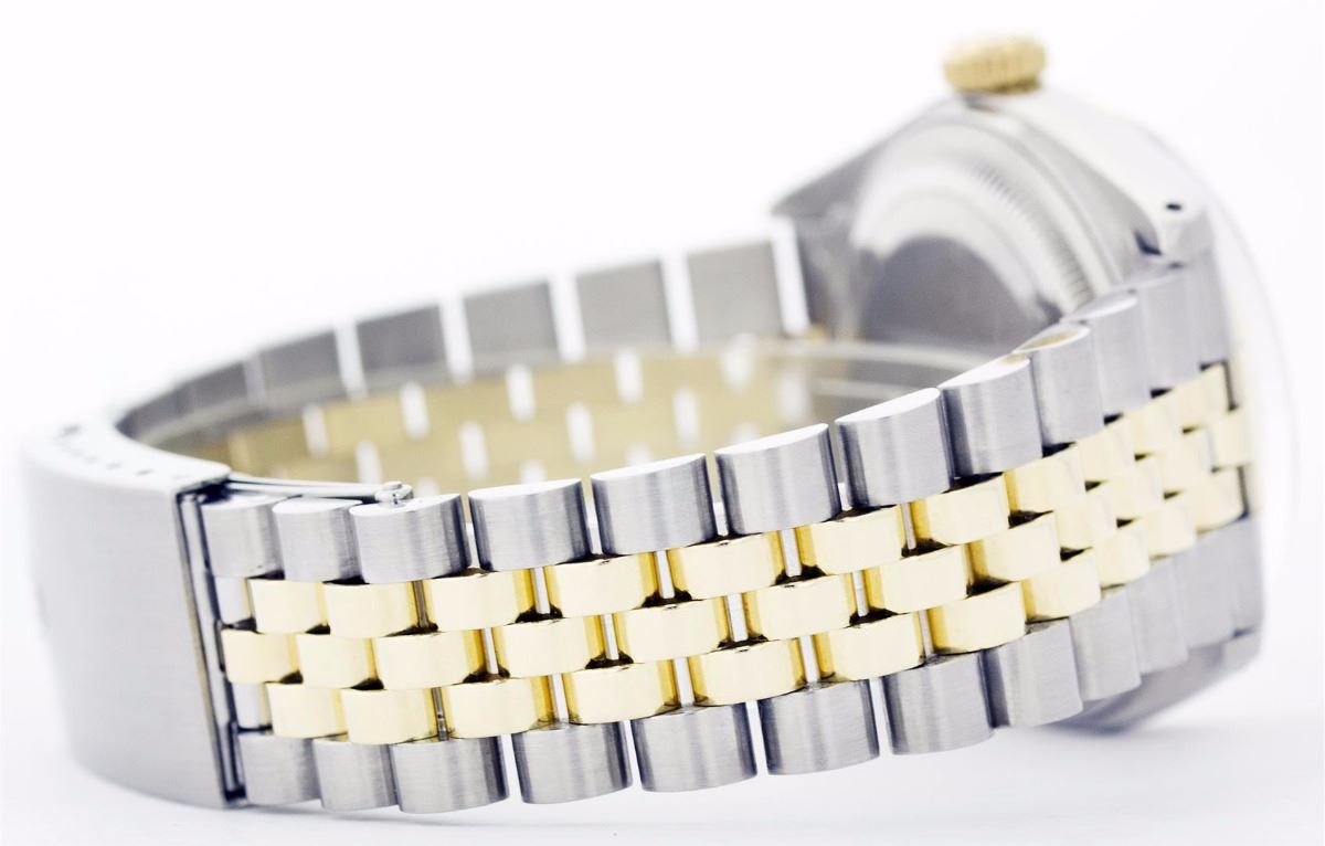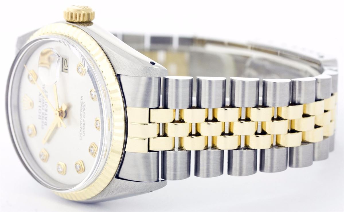 One Mens Two Tone Rolex Datejust Polished, Serviced & Electronically Tested, 14K Yellow Gold & Stainless Steel Case:36mm, 14K Yellow Gold Crown, Custom Bezel: 14K Yellow Gold Fluted Bezel. Custom Crystal: Acrylic Cyclops Lens. Movement: Automatic Winding Movement Caliber 3035. Custom Dial: Silver Dial Set With Diamond Hour Markers, 10 Diamond in Dial G To H In Color, SI-VS Clarity. Date Window: 3 O'Clock Position Date Display, Quickset, Model: 16013 Condition: G-6 Extra Fine. Bracelet:Two Tone 14K Yellow Gold & Stainless Steel Jubilee. Bright Polish. 6.5 Inch Length, Adjustable. Standard Clasp, With Rolex Logo.