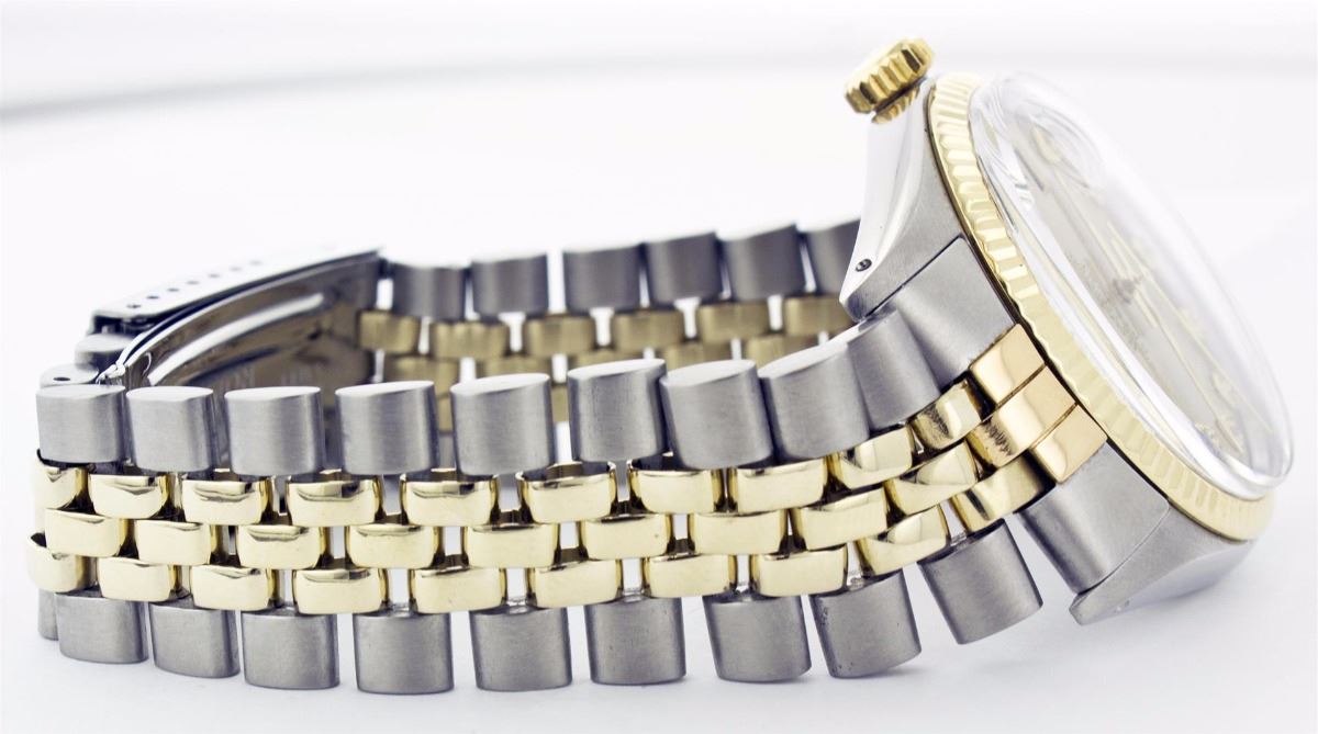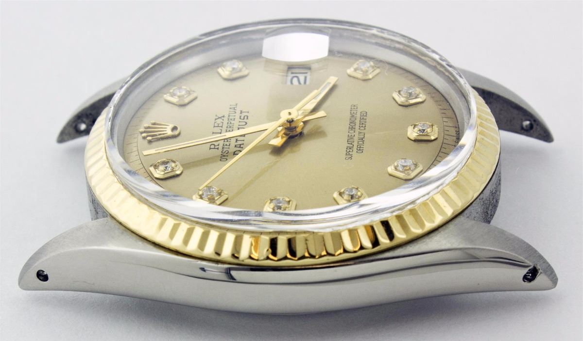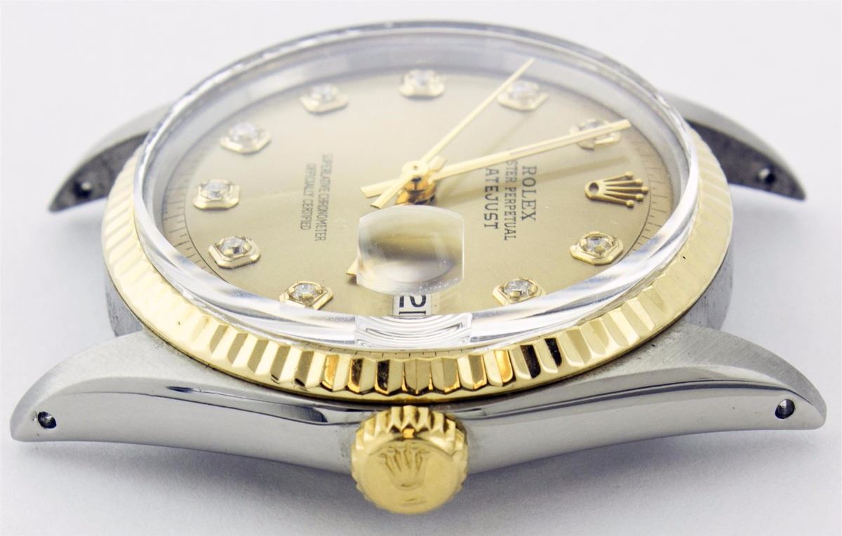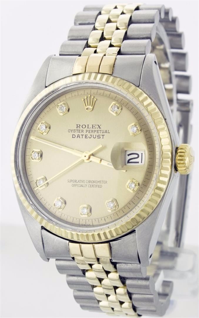 One Gents Two Tone Rolex Datejust Polished, Serviced & Electronically Tested, 14K Yellow Gold & Stainless Steel Case:36mm, 14K Yellow Gold Crown, Bezel: 18K Yellow Gold Fluted Bezel. Custom Crystal: Acrylic Cyclops Lens. Movement: Automatic Winding Movement Caliber 3035. Custom Dial: Champagne With Diamond Hour Markers, Diamond Count: 10 Diamonds, Color: G to H, Clarity: SI-VS Date Window: 3 O'Clock Position Date Display, Quickset, Model: 16013 Condition: G-6 Extra Fine. Bracelet: Two Tone 14K Yellow Gold & Stainless Steel Jubilee. Bright Polish. 6.5 Inch Length, Adjustable. Standard Clasp, With Rolex Logo.