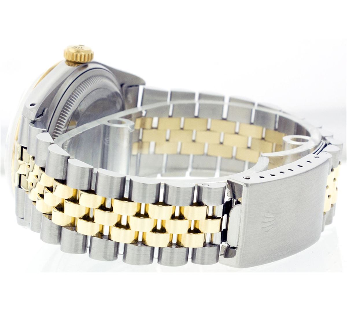 One Mens Two Tone Rolex Datejust Polished, Serviced & Electronically Tested, 14K Yellow Gold & Stainless Steel Case:36mm, 14K Yellow Gold Crown, Bezel: 18K Yellow Gold Fluted Bezel. Custom Crystal: Acrylic Cyclops Lens. Movement: Automatic Winding Movement Caliber 3035. Custom Dial: Champagne Dial Set With Diamond Hour Markers and Baguette Diamonds On The Six And Nine Hour Markers, 8 Diamonds + 2 Baguettes in Dial G To H In Color, Si-VS Clarity. Date Window: 3 O'Clock Position Date Display, Quickset, Model: 16013 Condition: G-6 Extra Fine. Bracelet:Two Tone 14K Yellow Gold & Stainless Steel Jubilee. Bright Polish. 6.5 Inch Length, Adjustable. Standard Clasp, With Rolex Logo.