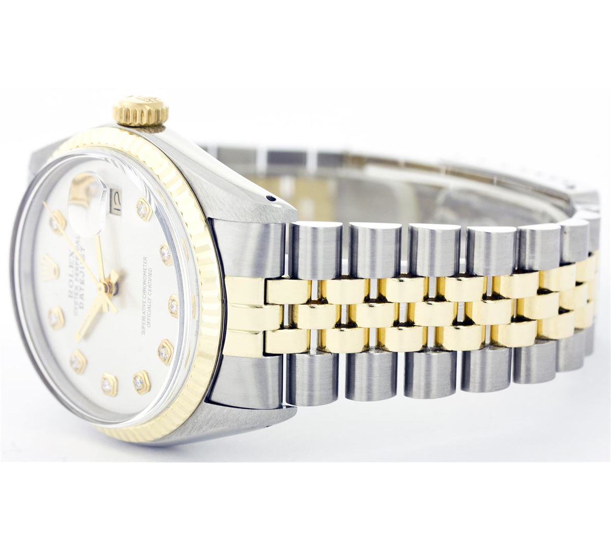 One Mens Two Tone Rolex Datejust Polished, Serviced & Electronically Tested, 14K Yellow Gold & Stainless Steel Case:36mm, 14K Yellow Gold Crown, Custom Bezel: 14K Yellow Gold Fluted Bezel. Custom Crystal: Acrylic Cyclops Lens. Movement: Automatic Winding Movement Caliber 3035. Custom Dial: Silver Dial Set With Diamond Hour Markers, 10 Diamond in Dial G To H In Color, SI-VS Clarity. Date Window: 3 O'Clock Position Date Display, Quickset, Model: 16013 Condition: G-6 Extra Fine. Bracelet:Two Tone 14K Yellow Gold & Stainless Steel Jubilee. Bright Polish. 6.5 Inch Length, Adjustable. Standard Clasp, With Rolex Logo.