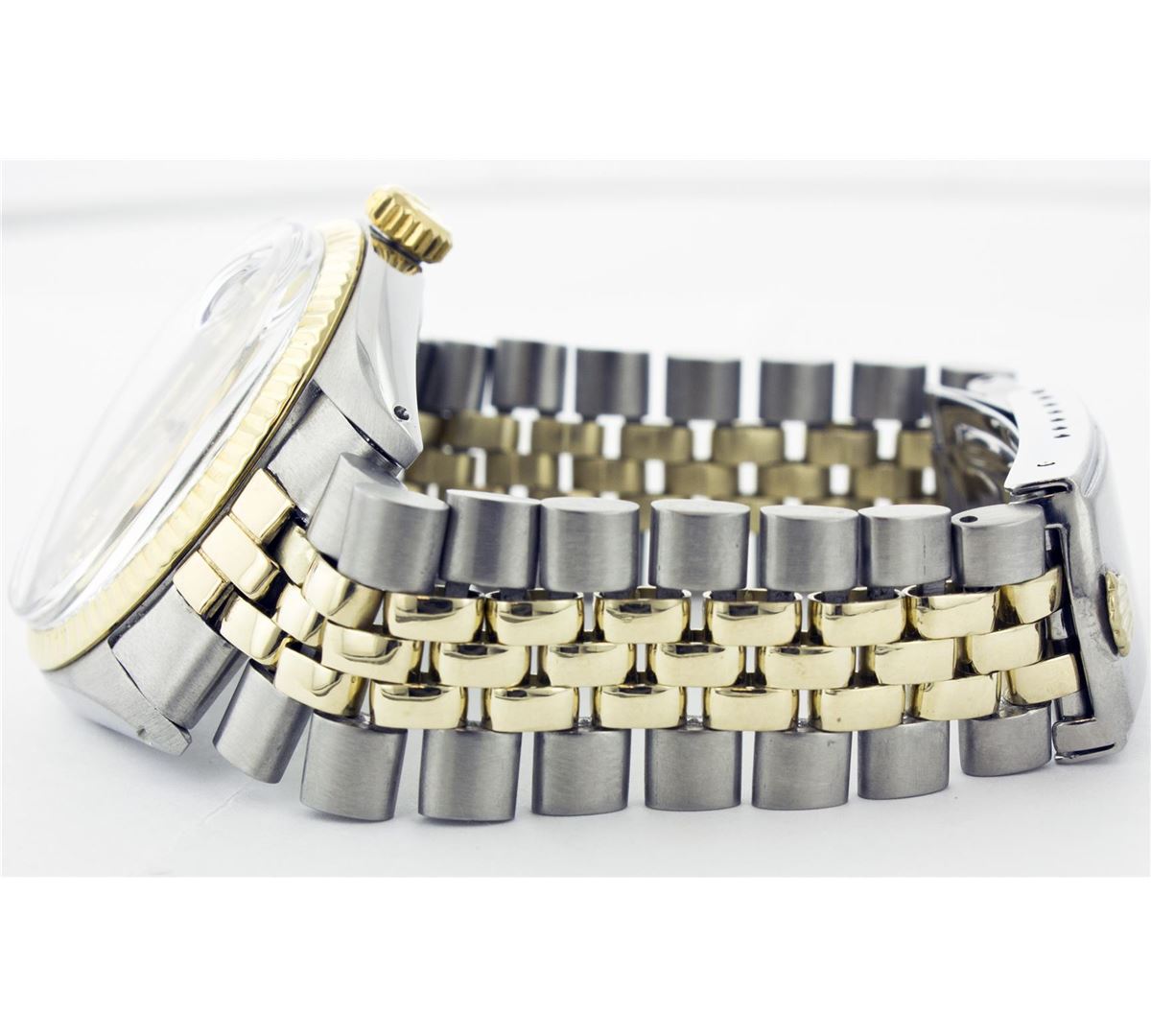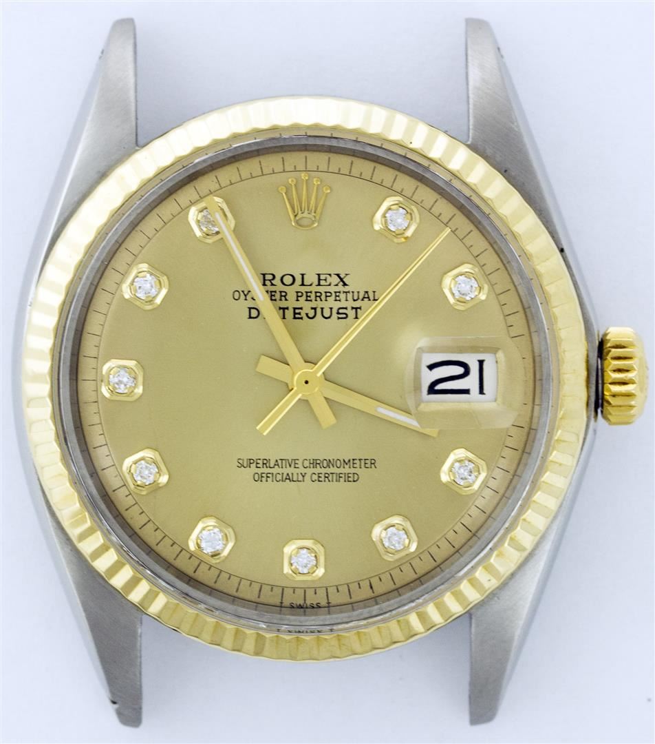 One Gents Two Tone Rolex Datejust Polished, Serviced & Electronically Tested, 14K Yellow Gold & Stainless Steel Case:36mm, 14K Yellow Gold Crown, Bezel: 18K Yellow Gold Fluted Bezel. Custom Crystal: Acrylic Cyclops Lens. Movement: Automatic Winding Movement Caliber 3035. Custom Dial: Champagne With Diamond Hour Markers, Diamond Count: 10 Diamonds, Color: G to H, Clarity: SI-VS Date Window: 3 O'Clock Position Date Display, Quickset, Model: 16013 Condition: G-6 Extra Fine. Bracelet: Two Tone 14K Yellow Gold & Stainless Steel Jubilee. Bright Polish. 6.5 Inch Length, Adjustable. Standard Clasp, With Rolex Logo.
