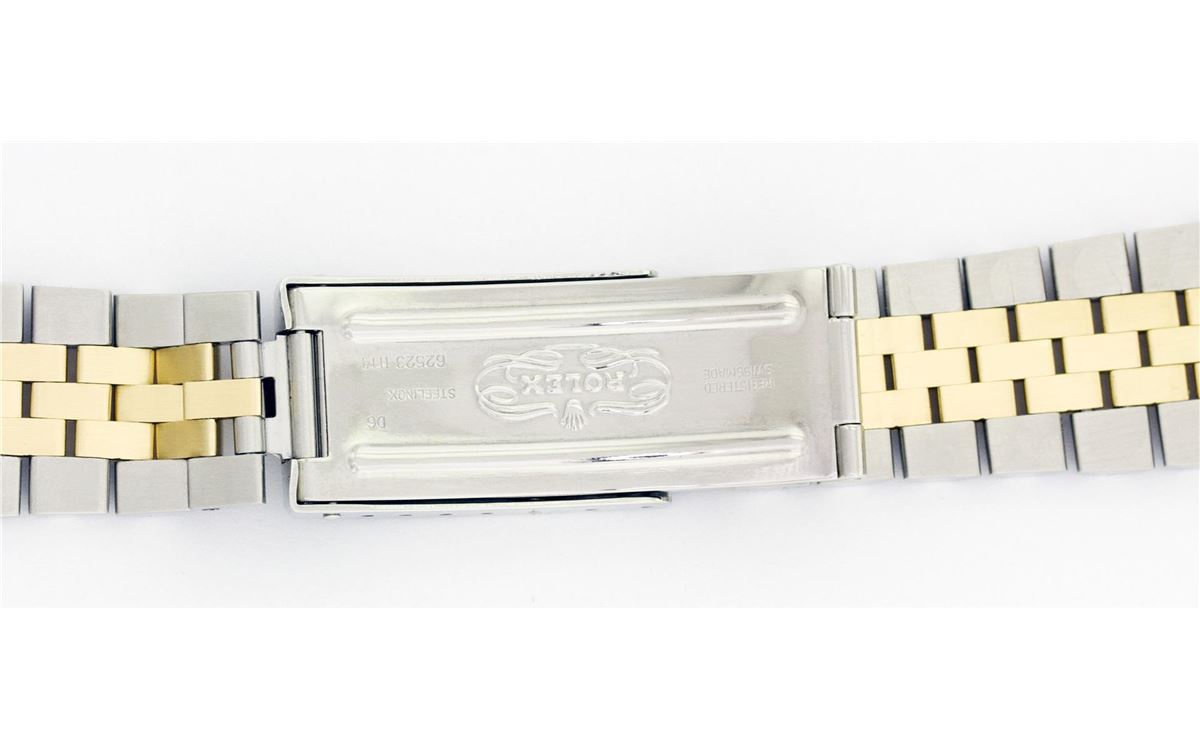One Mens Two Tone Rolex Datejust Polished, Serviced & Electronically Tested, 14K Yellow Gold & Stainless Steel Case:36mm, 14K Yellow Gold Crown, Custom Bezel: 18K Yellow Gold Beadset Diamond Bezel, Diamond Count: 44 Diamonds Total Weight 1.00 Carat, Clarity: Si-VS, Color: G to H. Custom Crystal: Synthetic Sapphire Cyclops Lens. Movement: Automatic Winding Movement Caliber 3035. Custom Dial: Slate Grey Roman Dial With Track. Date Window: 3 O'Clock Position Date Display, Quickset, Model: 16013 Condition: G-6 Extra Fine. Bracelet: Two Tone 14K Yellow Gold & Stainless Steel Jubilee. Bright Polish. 6.5 Inch Length, Adjustable. Standard Clasp, With Rolex Logo.