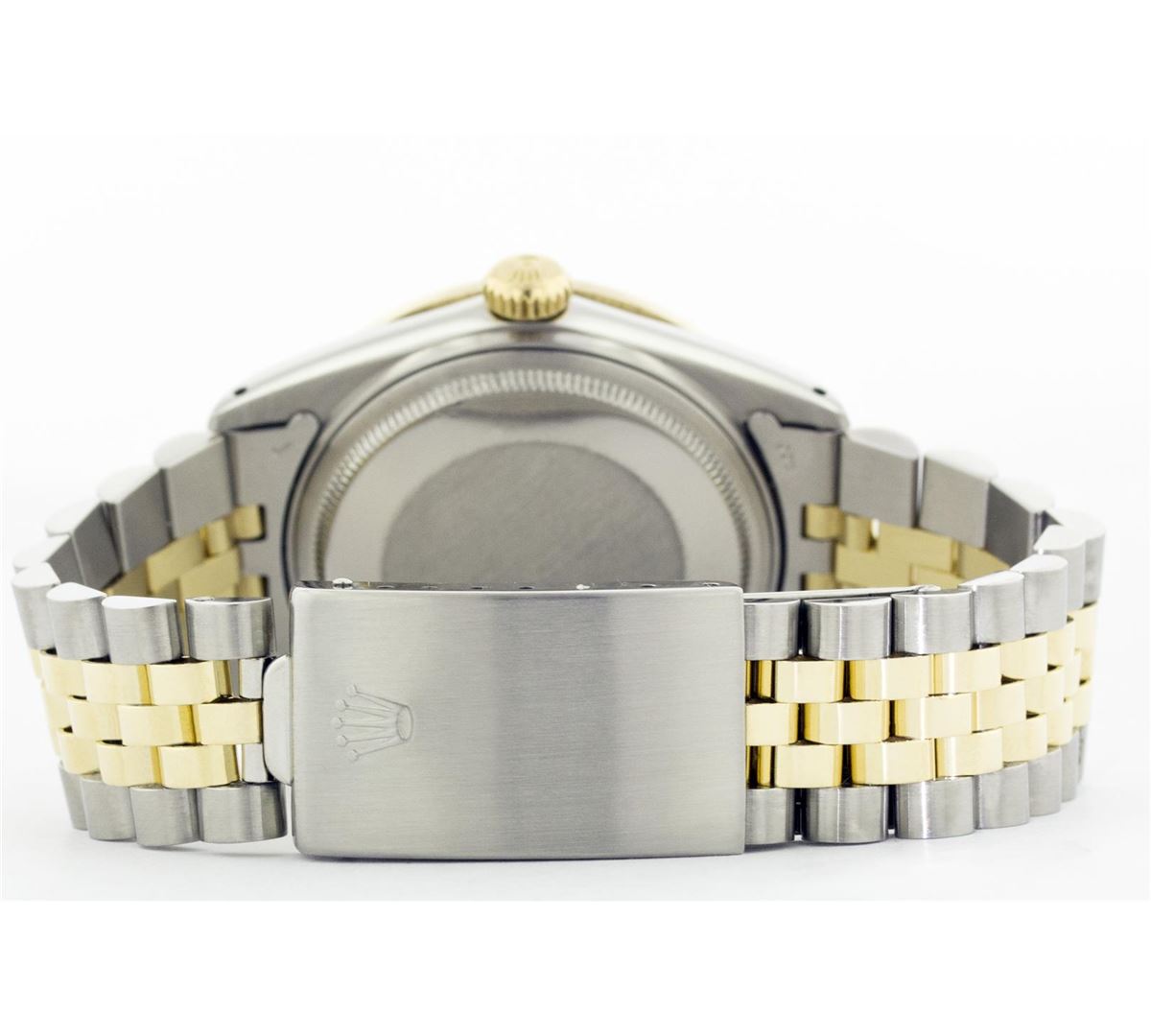 One Mens Two Tone Rolex Datejust Polished, Serviced & Electronically Tested, 14K Yellow Gold & Stainless Steel Case:36mm, 14K Yellow Gold Crown, Custom Bezel: 18K Yellow Gold Beadset Diamond Bezel, Diamond Count: 44 Diamonds Total Weight 1.00 Carat, Clarity: Si-VS, Color: G to H. Custom Crystal: Synthetic Sapphire Cyclops Lens. Movement: Automatic Winding Movement Caliber 3035. Custom Dial: Slate Grey Roman Dial With Track. Date Window: 3 O'Clock Position Date Display, Quickset, Model: 16013 Condition: G-6 Extra Fine. Bracelet: Two Tone 14K Yellow Gold & Stainless Steel Jubilee. Bright Polish. 6.5 Inch Length, Adjustable. Standard Clasp, With Rolex Logo.
