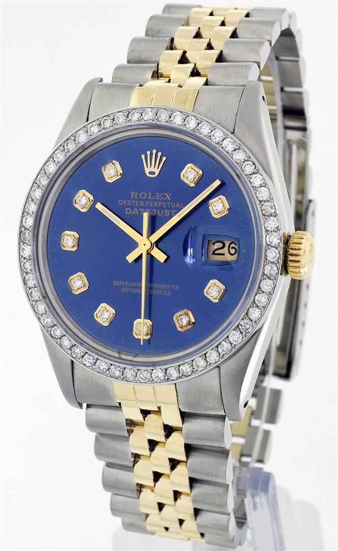 One Mens Two Tone Rolex Datejust Polished, Serviced & Electronically Tested, 14K Yellow Gold & Stainless Steel Case:36mm, 14K Yellow Gold Crown, Custom Bezel: Stainless Steel Beadset Diamond Bezel, Diamond Count: 54 Diamonds Total Weight 1.0 Carat, Clarity: Si-VS, Color: G to H. Custom Crystal: Synthetic Sapphire Cyclops Lens. Movement: Automatic Winding Movement Caliber 3035. Custom Dial: Blue Dial With Diamond Hour Markers and Small Track. Date Window: 3 O'Clock Position Date Display, Quickset, Model: 16013 Condition: G-6 Extra Fine. Bracelet: Two Tone 14K Yellow Gold & Stainless Steel Jubilee. Bright Polish. 6.5 Inch Length, Adjustable. Standard Clasp, With Rolex Logo.