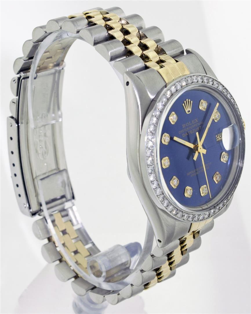 One Mens Two Tone Rolex Datejust Polished, Serviced & Electronically Tested, 14K Yellow Gold & Stainless Steel Case:36mm, 14K Yellow Gold Crown, Custom Bezel: Stainless Steel Beadset Diamond Bezel, Diamond Count: 54 Diamonds Total Weight 1.0 Carat, Clarity: Si-VS, Color: G to H. Custom Crystal: Synthetic Sapphire Cyclops Lens. Movement: Automatic Winding Movement Caliber 3035. Custom Dial: Blue Dial With Diamond Hour Markers and Small Track. Date Window: 3 O'Clock Position Date Display, Quickset, Model: 16013 Condition: G-6 Extra Fine. Bracelet: Two Tone 14K Yellow Gold & Stainless Steel Jubilee. Bright Polish. 6.5 Inch Length, Adjustable. Standard Clasp, With Rolex Logo.