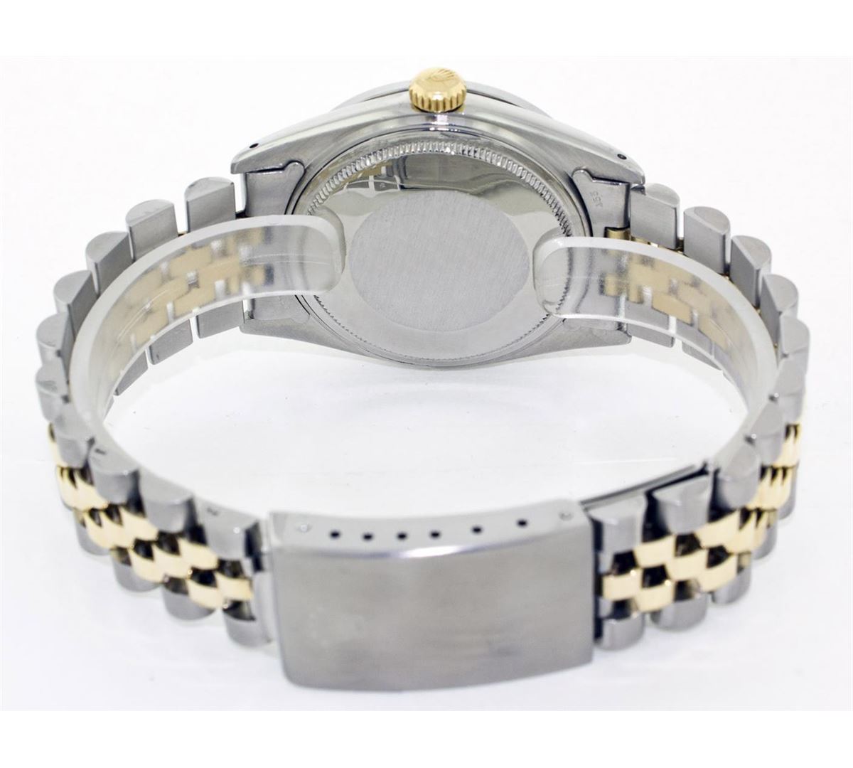 One Mens Two Tone Rolex Datejust Polished, Serviced & Electronically Tested, 14K Yellow Gold & Stainless Steel Case:36mm, 14K Yellow Gold Crown, Custom Bezel: Stainless Steel Beadset Diamond Bezel, Diamond Count: 54 Diamonds Total Weight 1.0 Carat, Clarity: Si-VS, Color: G to H. Custom Crystal: Synthetic Sapphire Cyclops Lens. Movement: Automatic Winding Movement Caliber 3035. Custom Dial: Blue Dial With Diamond Hour Markers and Small Track. Date Window: 3 O'Clock Position Date Display, Quickset, Model: 16013 Condition: G-6 Extra Fine. Bracelet: Two Tone 14K Yellow Gold & Stainless Steel Jubilee. Bright Polish. 6.5 Inch Length, Adjustable. Standard Clasp, With Rolex Logo.
