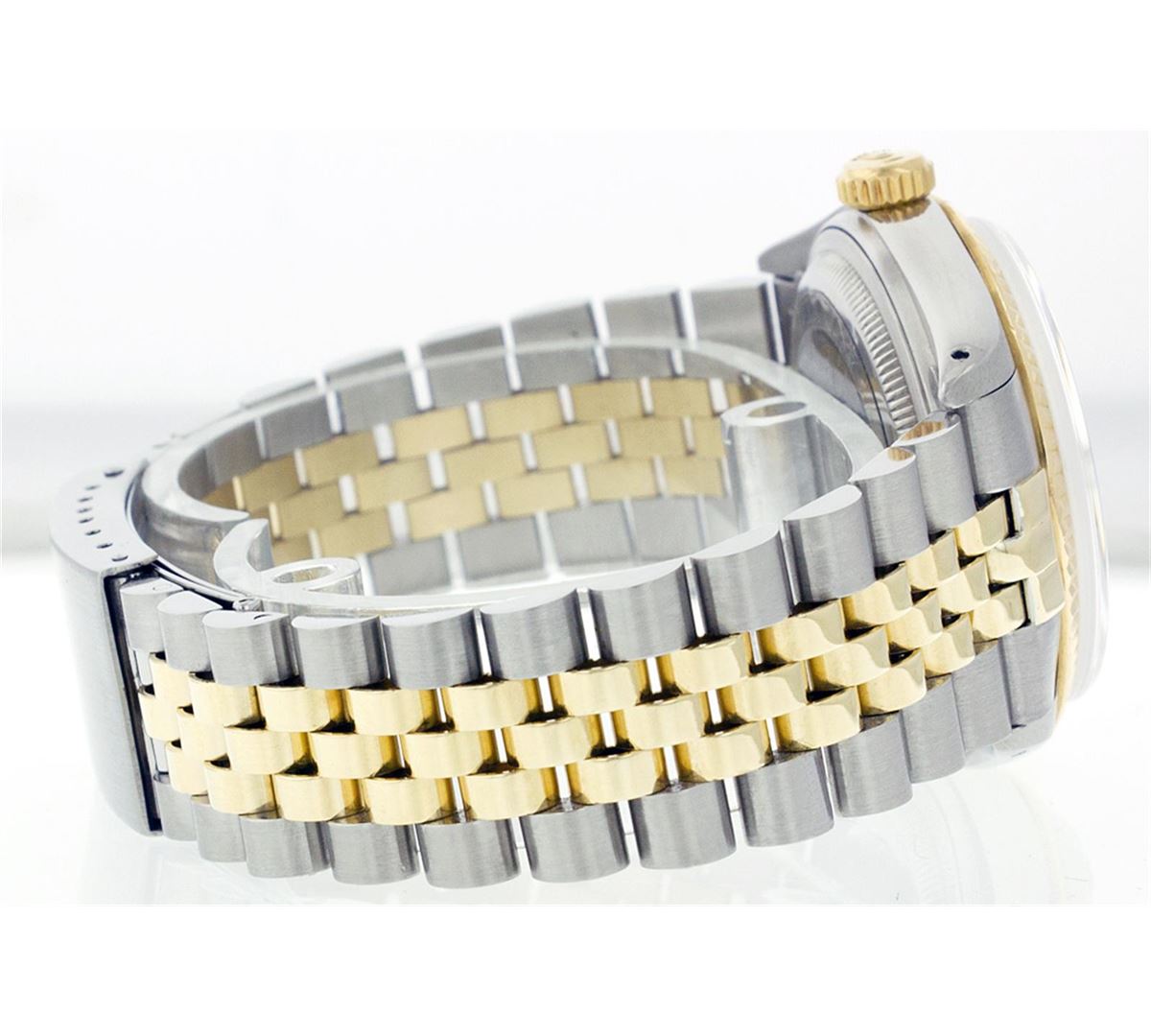 One Mens Two Tone Rolex Datejust Polished, Serviced & Electronically Tested, 14K Yellow Gold & Stainless Steel Case:36mm, 14K Yellow Gold Crown, Bezel: 18K Yellow Gold Fluted Bezel. Custom Crystal: Acrylic Cyclops Lens. Movement: Automatic Winding Movement Caliber 3035. Custom Dial: Champagne Dial Set With Diamond Hour Markers and Baguette Diamonds On The Six And Nine Hour Markers, 8 Diamonds + 2 Baguettes in Dial G To H In Color, Si-VS Clarity. Date Window: 3 O'Clock Position Date Display, Quickset, Model: 16013 Condition: G-6 Extra Fine. Bracelet:Two Tone 14K Yellow Gold & Stainless Steel Jubilee. Bright Polish. 6.5 Inch Length, Adjustable. Standard Clasp, With Rolex Logo.
