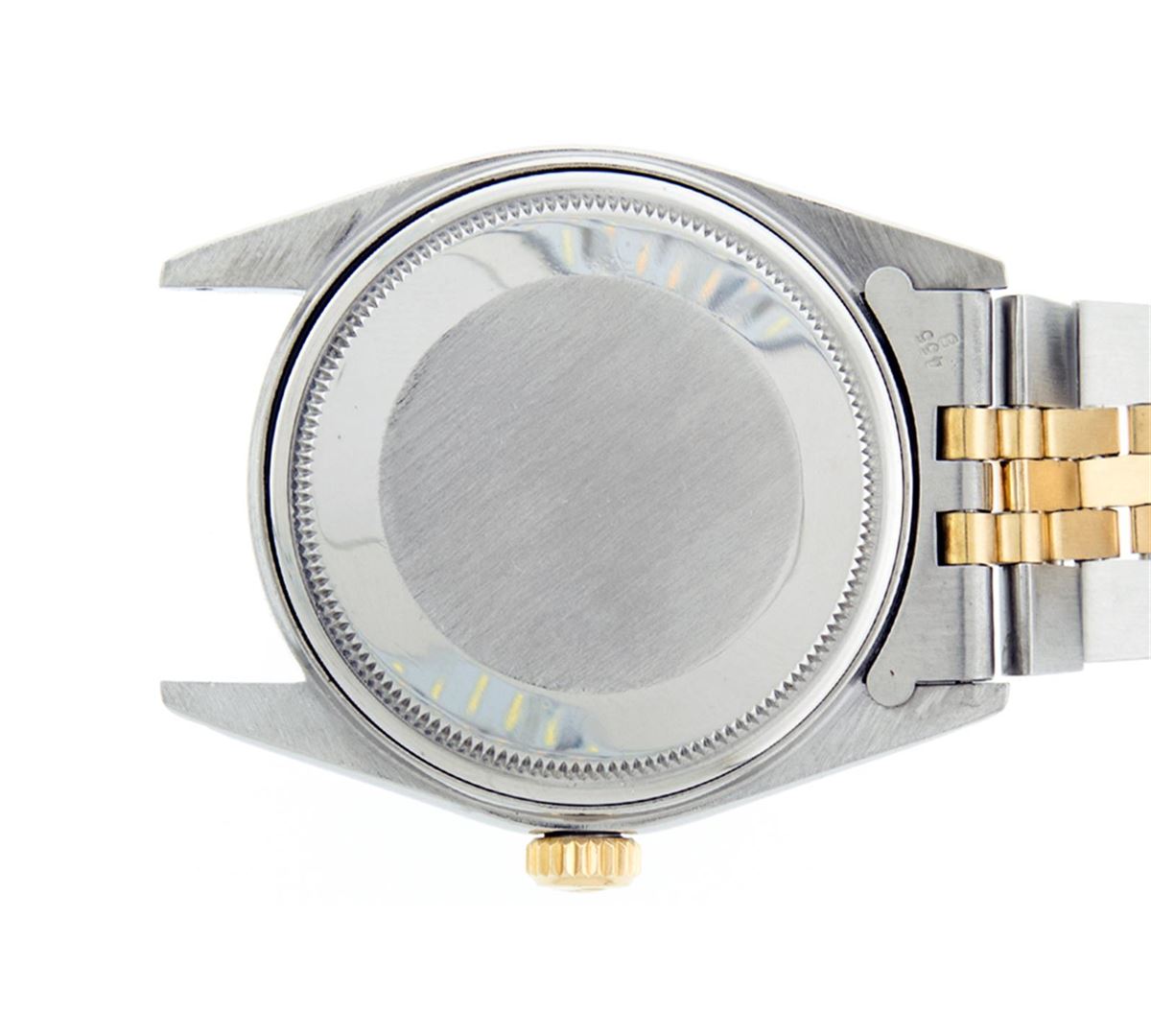 One Gents Two Tone Rolex Datejust Polished, Serviced & Electronically Tested, 14K Yellow Gold & Stainless Steel Case:36mm, 14K Yellow Gold Crown, Bezel: 14K Yellow Gold Fluted Bezel. Custom Crystal: Acrylic Cyclops Lens. Movement: Automatic Winding Movement Caliber 3035. Custom Dial: Black Diamond Dial, Diamond Count: 10 Diamonds In Dial, Color: G to H, Clarity: SI-VS. Date Window: 3 O'clock Position Date Display, Quickset, Model: 16013 Condition: G-6 Extra Fine. Bracelet: Two Tone 14K Yellow Gold & Stainless Steel Jubilee. Bright Polish. 6.5 Inch Length, Adjustable. Standard Clasp, With Rolex Logo.