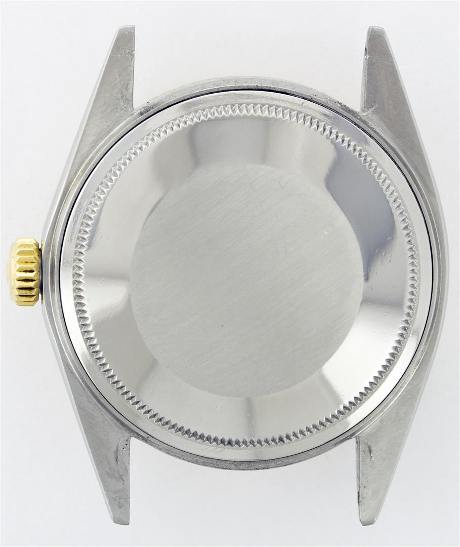 One Gents Two Tone Rolex Datejust Polished, Serviced & Electronically Tested, 14K Yellow Gold & Stainless Steel Case:36mm, 14K Yellow Gold Crown, Bezel: 18K Yellow Gold Fluted Bezel. Custom Crystal: Acrylic Cyclops Lens. Movement: Automatic Winding Movement Caliber 3035. Custom Dial: Champagne With Diamond Hour Markers, Diamond Count: 10 Diamonds, Color: G to H, Clarity: SI-VS Date Window: 3 O'Clock Position Date Display, Quickset, Model: 16013 Condition: G-6 Extra Fine. Bracelet: Two Tone 14K Yellow Gold & Stainless Steel Jubilee. Bright Polish. 6.5 Inch Length, Adjustable. Standard Clasp, With Rolex Logo.