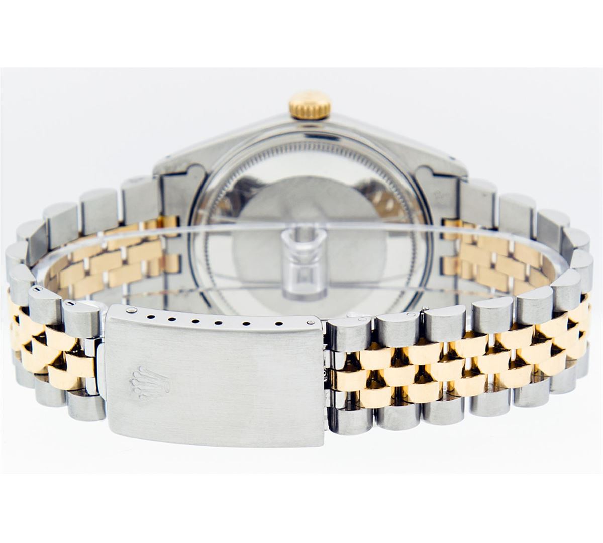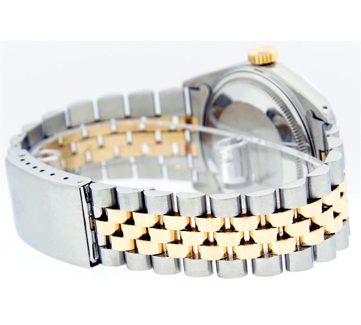 One Gents Two Tone Rolex Datejust Polished, Serviced & Electronically Tested, 14K Yellow Gold & Stainless Steel Case:36mm, 14K Yellow Gold Crown, Bezel: 14K Yellow Gold Fluted Bezel. Custom Crystal: Acrylic Cyclops Lens. Movement: Automatic Winding Movement Caliber 3035. Custom Dial: Black Diamond Dial, Diamond Count: 10 Diamonds In Dial, Color: G to H, Clarity: SI-VS. Date Window: 3 O'clock Position Date Display, Quickset, Model: 16013 Condition: G-6 Extra Fine. Bracelet: Two Tone 14K Yellow Gold & Stainless Steel Jubilee. Bright Polish. 6.5 Inch Length, Adjustable. Standard Clasp, With Rolex Logo.