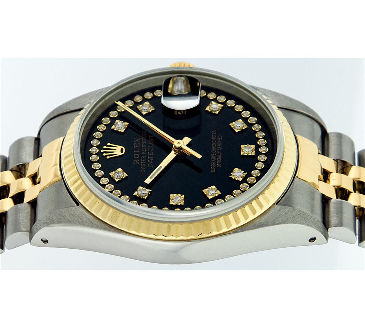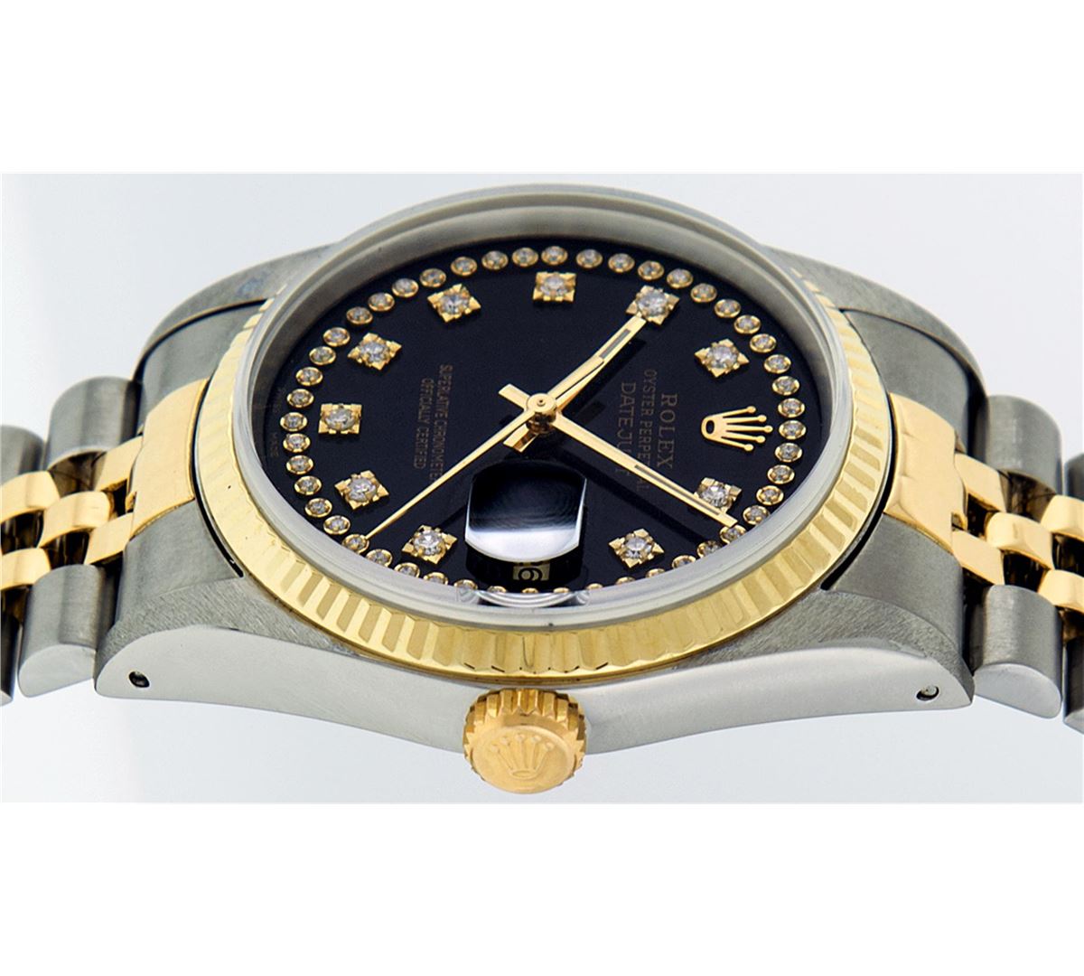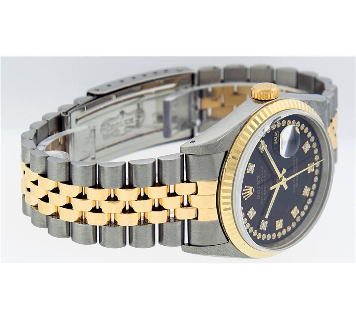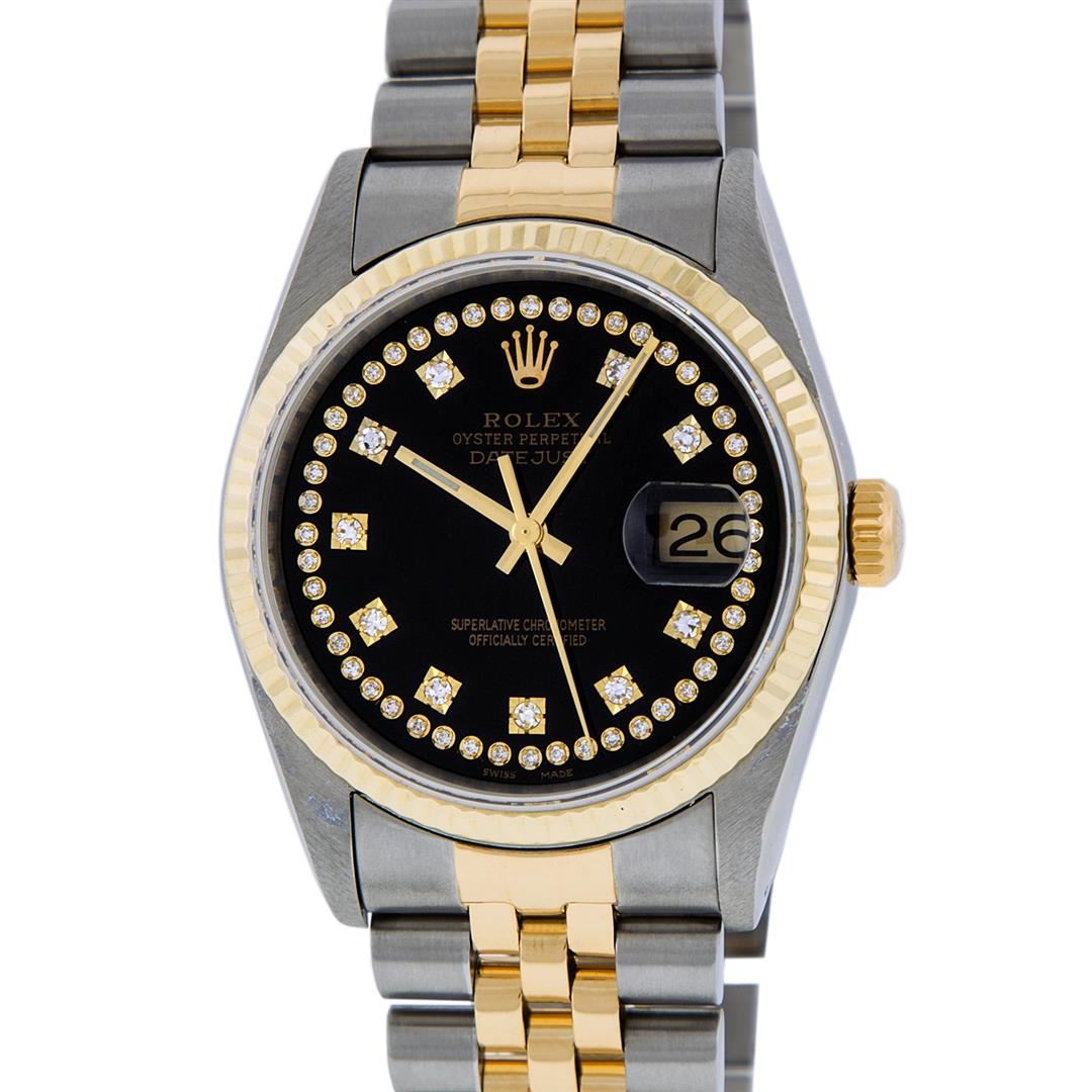 One Mens Two Tone Rolex Datejust Polished, Serviced & Electronically Tested, 14K Yellow Gold & Stainless Steel Case: 36mm, 14K Yellow Gold Crown, Bezel: 14K Yellow Gold Fluted Bezel. Custom Crystal: Acrylic Cyclops Lens. Movement: Automatic Winding Movement Caliber 3035. Custom Dial: Black String VVS Diamond Dial, Diamond Count: 58 Diamonds In Dial, Color: G to H, Clarity: VVS. Date Window: 3 O'Clock Position Date Display, Quickset, Model: 16013 Condition: G-6 Extra Fine. Bracelet: Two Tone 14K Yellow Gold & Stainless Steel Jubilee. Bright Polish. 7.0 Inch Length, Adjustable. Standard Clasp, With Rolex Logo.