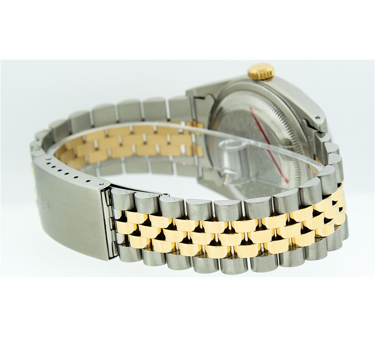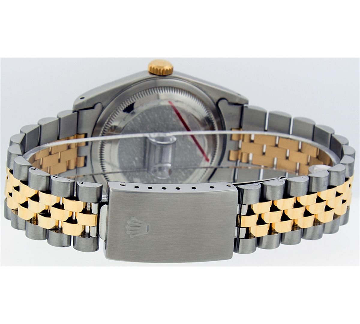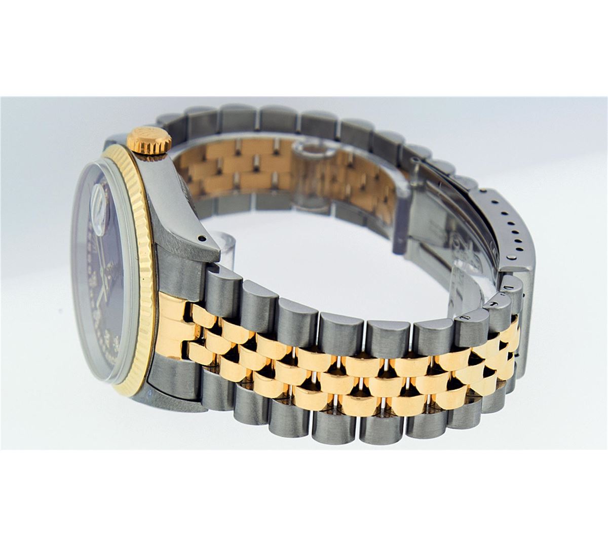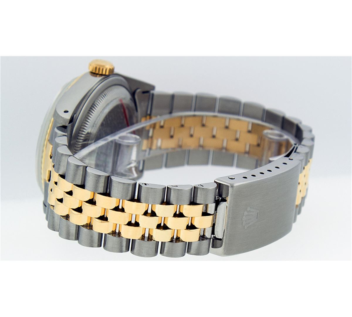 One Mens Two Tone Rolex Datejust Polished, Serviced & Electronically Tested, 14K Yellow Gold & Stainless Steel Case: 36mm, 14K Yellow Gold Crown, Bezel: 14K Yellow Gold Fluted Bezel. Custom Crystal: Acrylic Cyclops Lens. Movement: Automatic Winding Movement Caliber 3035. Custom Dial: Black String VVS Diamond Dial, Diamond Count: 58 Diamonds In Dial, Color: G to H, Clarity: VVS. Date Window: 3 O'Clock Position Date Display, Quickset, Model: 16013 Condition: G-6 Extra Fine. Bracelet: Two Tone 14K Yellow Gold & Stainless Steel Jubilee. Bright Polish. 7.0 Inch Length, Adjustable. Standard Clasp, With Rolex Logo.