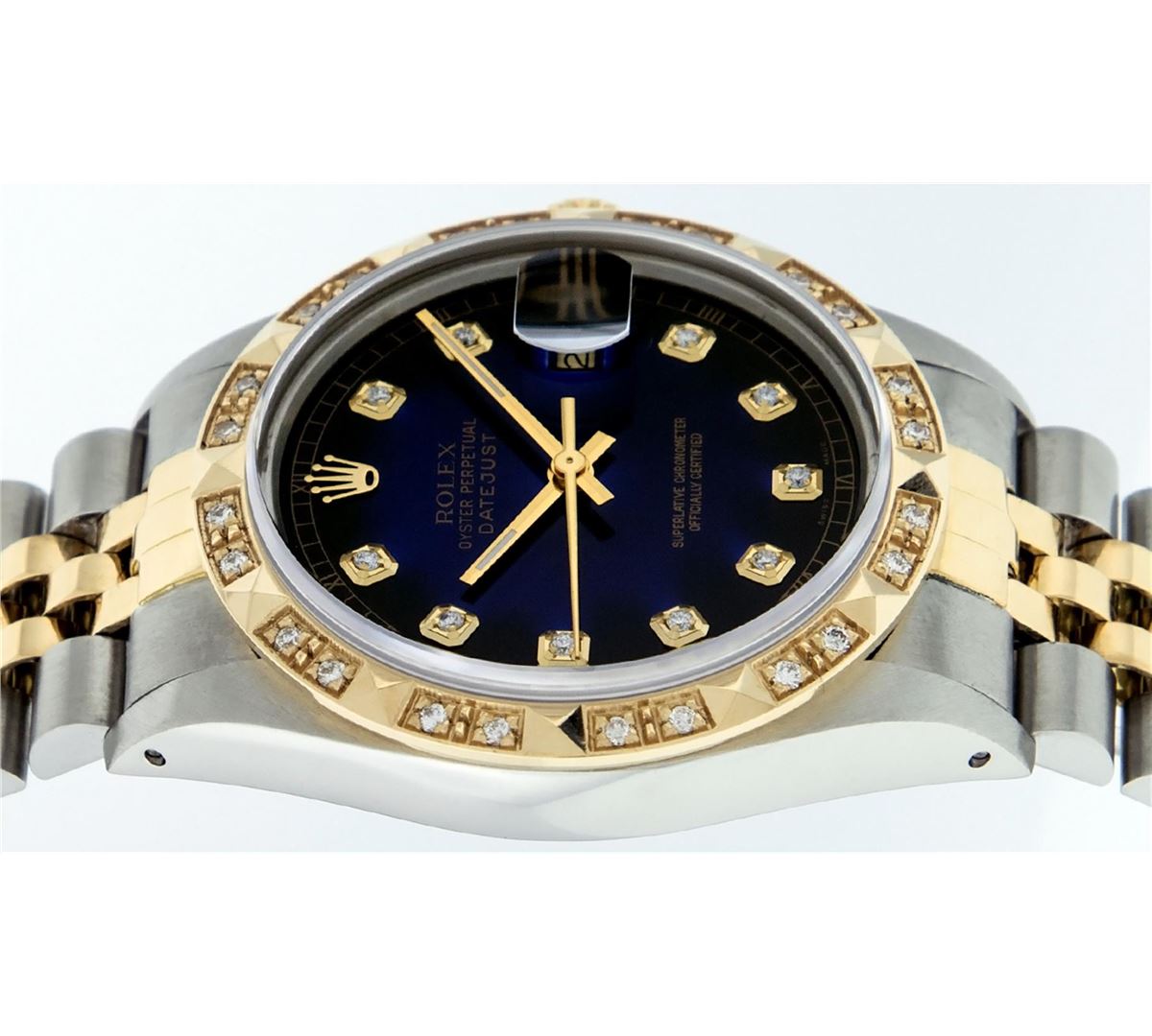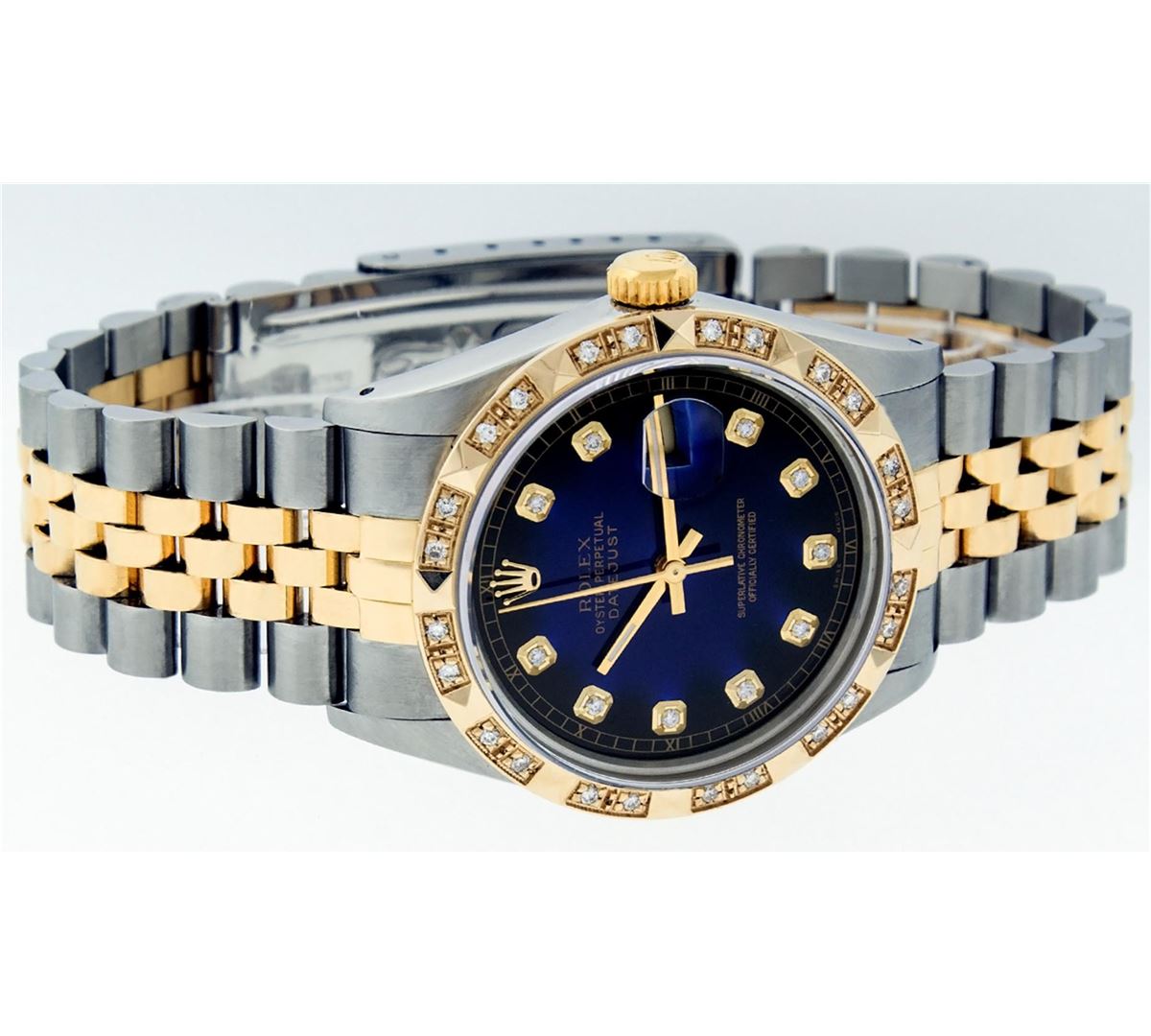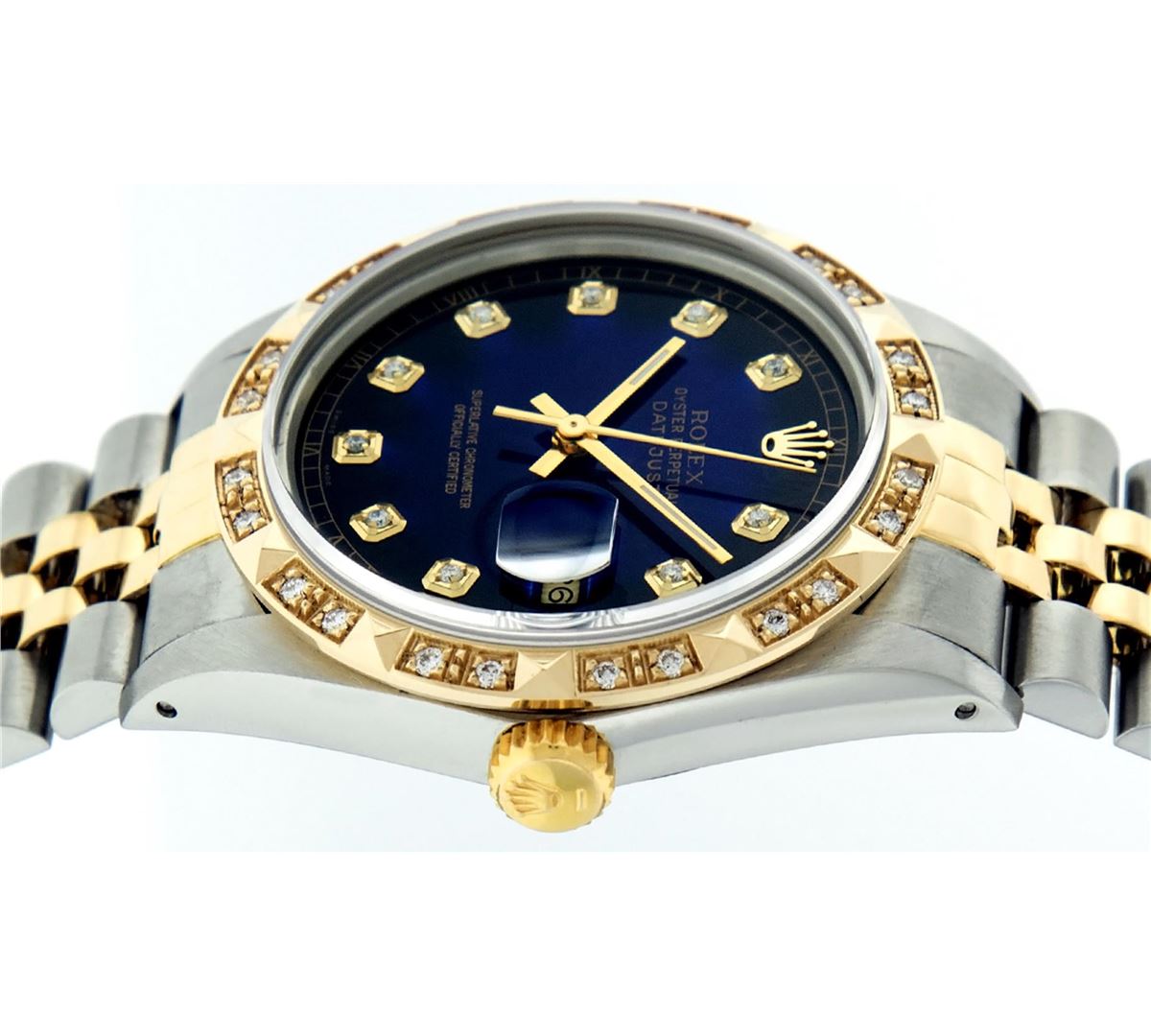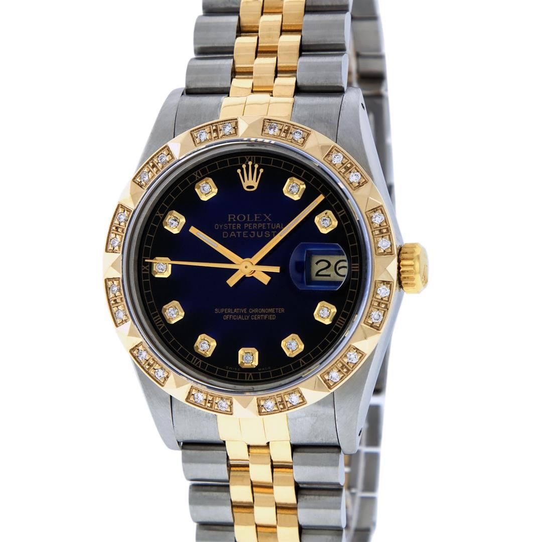 One Mens Two Tone Rolex Datejust Polished, Fully Serviced & Electronically Tested, 14K Yellow Gold & Stainless Steel Case:36mm, 14K Yellow Gold Crown, Custom Bezel: 18K Yellow Gold Pyramid Diamond Bezel, Diamond Count: 24 Diamonds, Total Weight .75 Carat, Clarity: Si-VS, Color: G to H. Custom Crystal: Synthetic Sapphire Cyclops Lens. Movement: Automatic Winding Movement Caliber 3035. Custom Dial: Blue Vignette Diamond Dial, Diamond Count: 10 Diamonds In Dial, Color: G to H, Clarity: SI -VS. Date Window: 3 O'Clock Position Date Display, Quickset, Model: 16013 Datejust. Condition: G-6 Extra Fine. Bracelet: Two Tone 14K Yellow Gold & Stainless Steel Jubilee. Bright Polish. 7.0 Inch Length, Adjustable. Standard Clasp, With Rolex Logo.