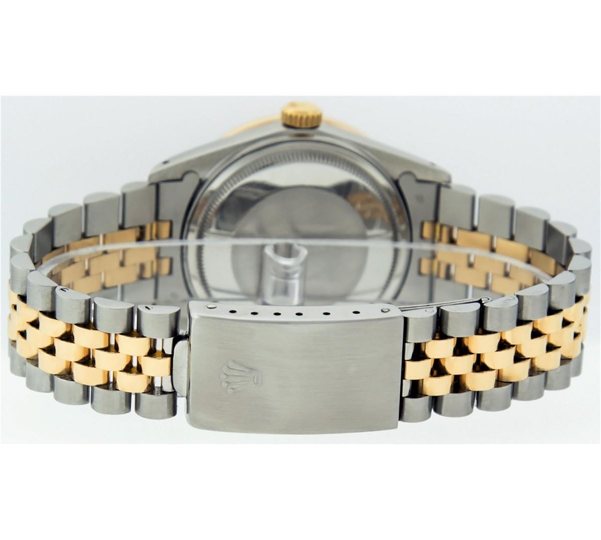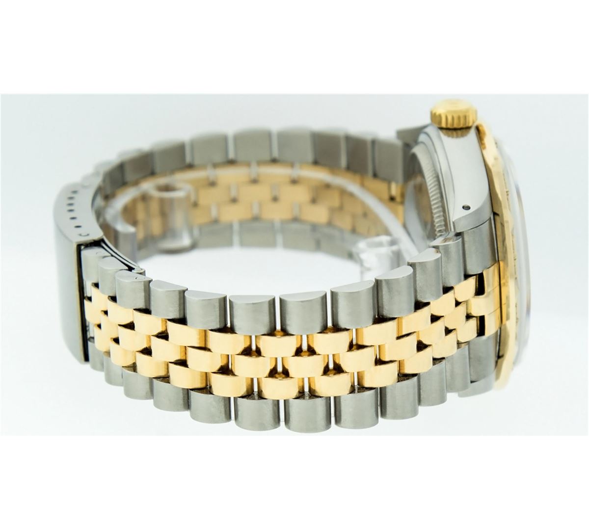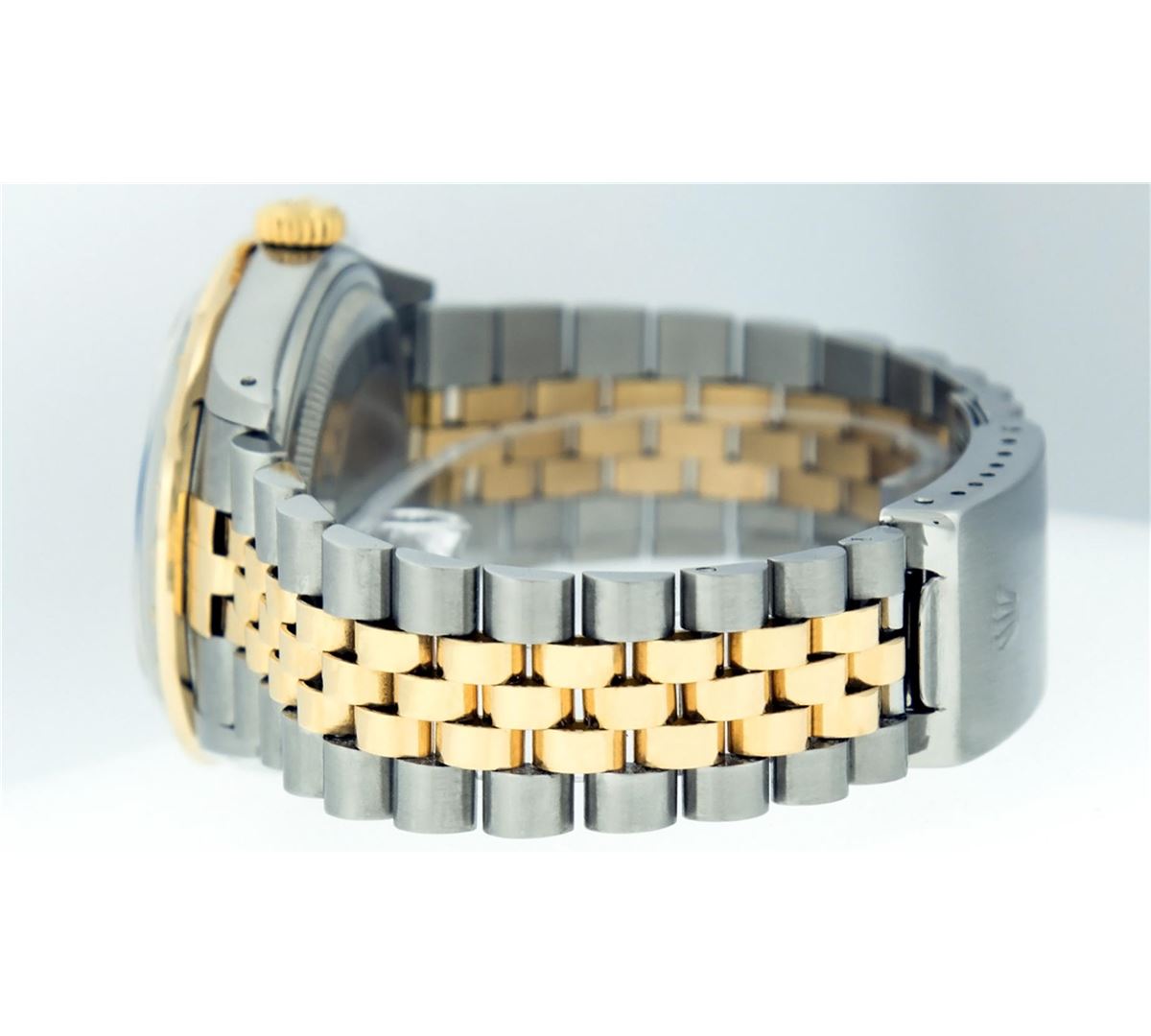 One Mens Two Tone Rolex Datejust Polished, Fully Serviced & Electronically Tested, 14K Yellow Gold & Stainless Steel Case:36mm, 14K Yellow Gold Crown, Custom Bezel: 18K Yellow Gold Pyramid Diamond Bezel, Diamond Count: 24 Diamonds, Total Weight .75 Carat, Clarity: Si-VS, Color: G to H. Custom Crystal: Synthetic Sapphire Cyclops Lens. Movement: Automatic Winding Movement Caliber 3035. Custom Dial: Blue Vignette Diamond Dial, Diamond Count: 10 Diamonds In Dial, Color: G to H, Clarity: SI -VS. Date Window: 3 O'Clock Position Date Display, Quickset, Model: 16013 Datejust. Condition: G-6 Extra Fine. Bracelet: Two Tone 14K Yellow Gold & Stainless Steel Jubilee. Bright Polish. 7.0 Inch Length, Adjustable. Standard Clasp, With Rolex Logo.